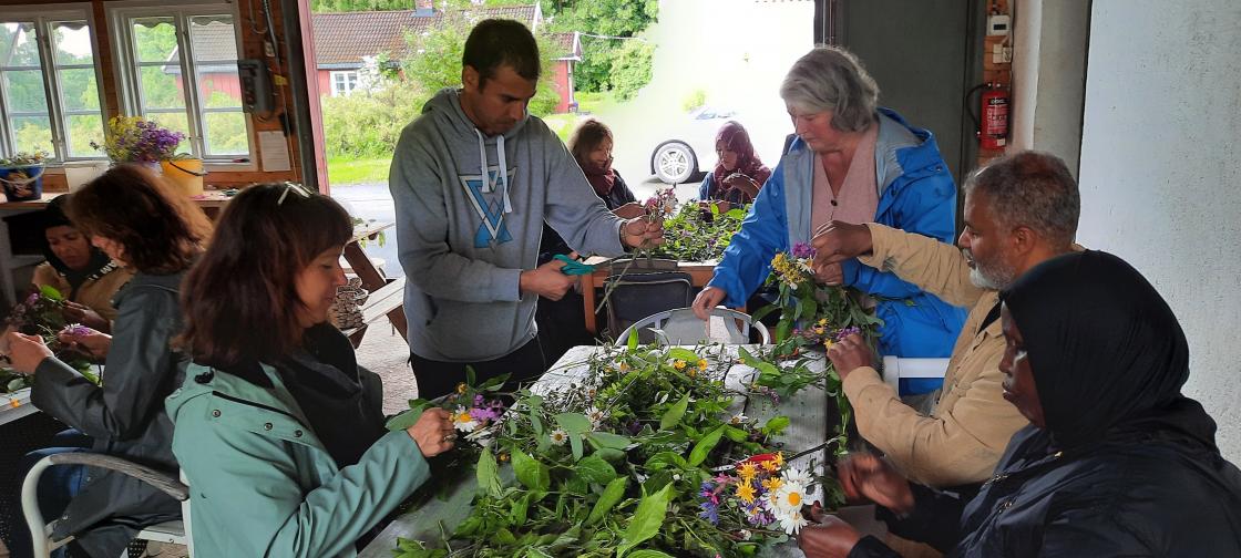 Det var en entusiastisk forsamling av kvinner og menn som samlet seg rundt bordene med et hav av vakre markblomster til å boltre seg med. I tillegg til å bli kjent med norske markblomster og lære å binde blomsterkranser, snakker vi norsk sammen. Det er fint å se hvor interesserte de er i å lære seg de norske ordene og å forme setninger på norsk - og ikke minst formidler de noe fra sin kultur til oss. Vi fikk bl.a. vite at det å binde blomsterkranser var mange kjent med fra sin egen kultur. Det ble laget veldig mange fine kranser - og mange laget flere for å ha med hjem til barna sine!