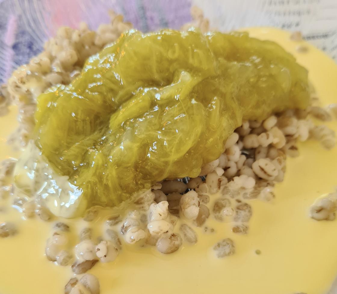 Legg opp byggryn med rabarbrasyltetøy på toppen i en skål.