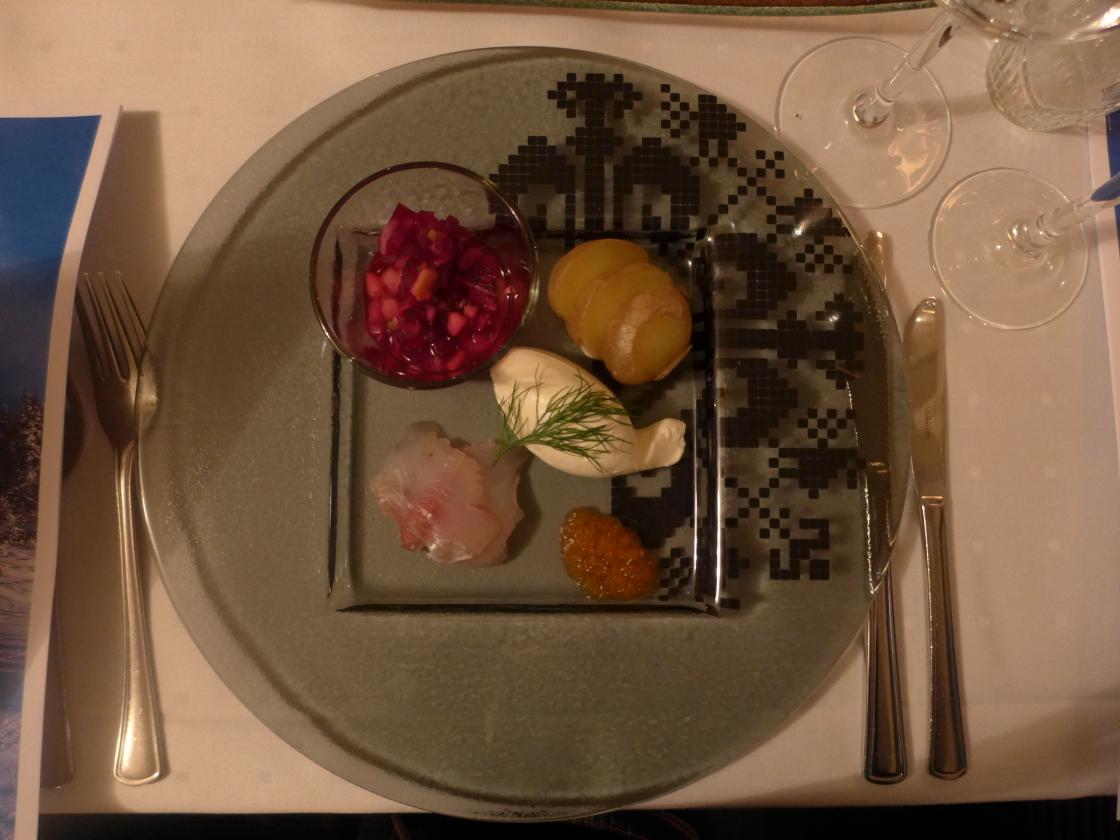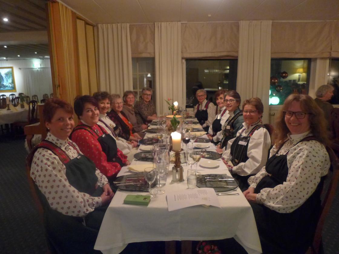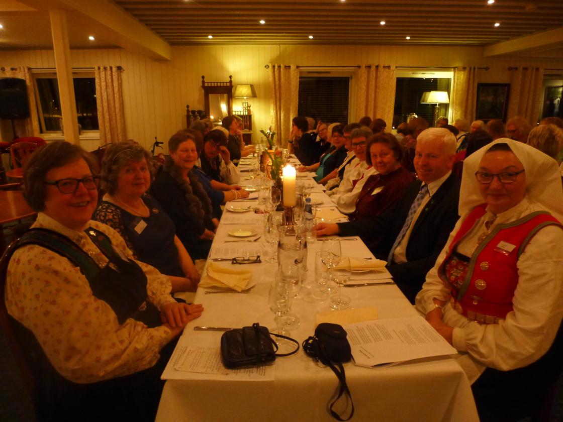 Festmiddag om kvelden. Her var det to-rettars, nydeleg middag. På menyen stod det: "Forrett: Husets gravede sik fra Norefjord og raket fjellørret-rogn fra Hardangervidda. Servert med rødbetesalsa, dampet Folva poteter fra Vestfold, rømme med lime og flatbrød fra Uvdal. Hovedrett: Langtidsbresert rulade av lammesider fra spælsaulam fra Vegglifjell og med husets hjemmelagede lammepølser, servert med ovnsbakte grønnsaker, kremet lammeskysaus med urter og kokkens potetmos/ puré." Eit herleg måltid!