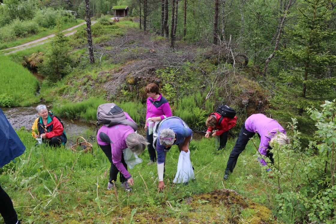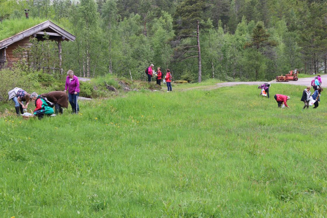 Lørdag morgen var vi ute og sanket på et fredfylt grønt platå, langt vekk fra eksos mm. Reine og fine vekster. Tilbake etter innsamlingen var det litt kaffe og mat, før vi fikk tildelt oppskriftene av Anne Lise. Vi ble inndelt i grupper, en rett til hver. Alltså 13 forskjellige