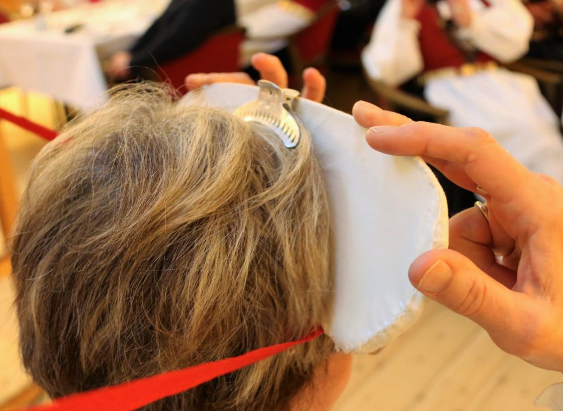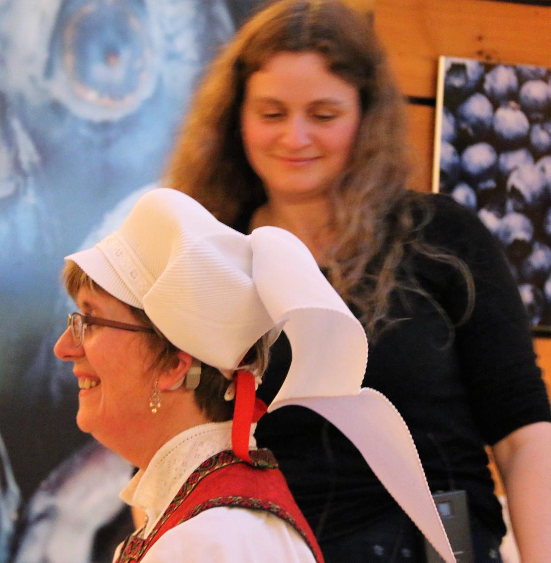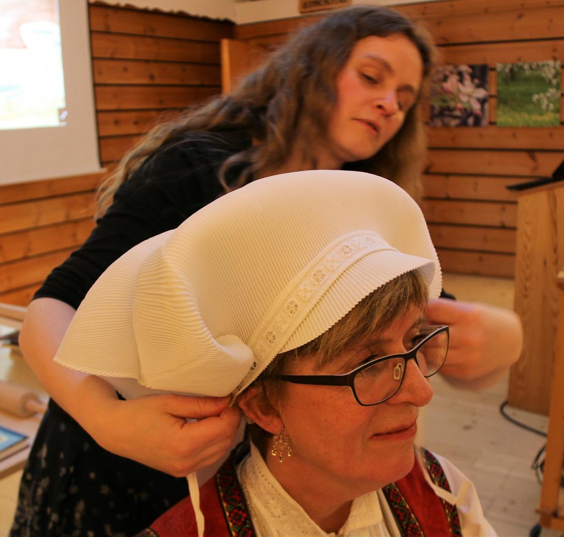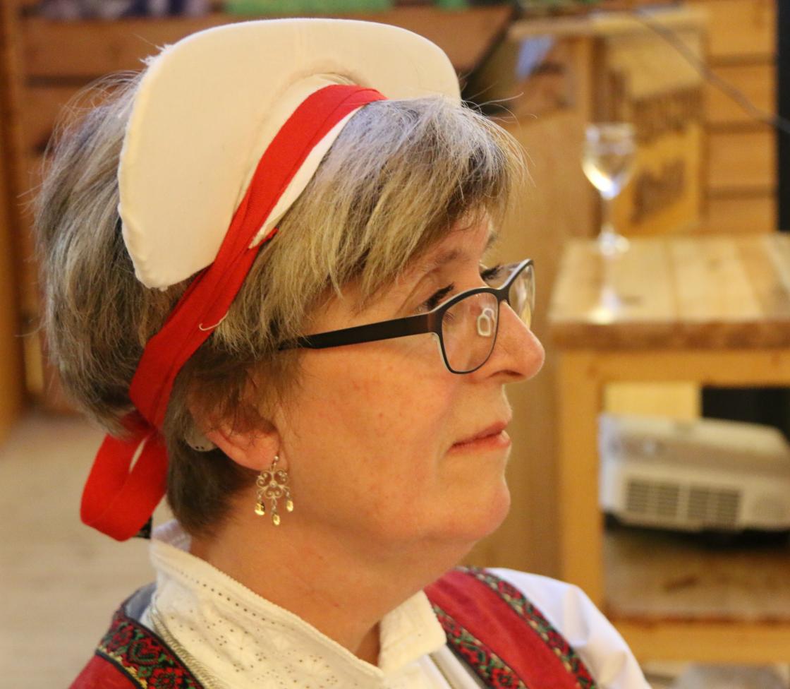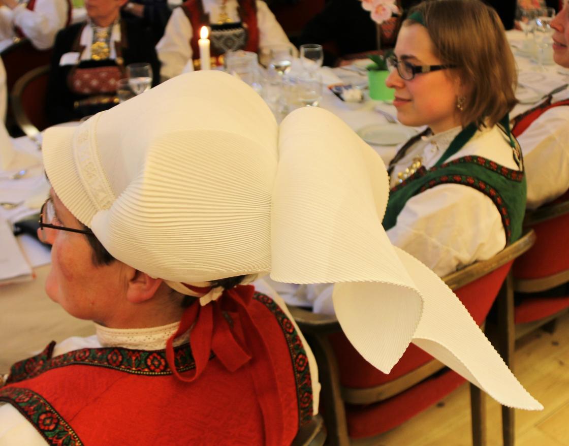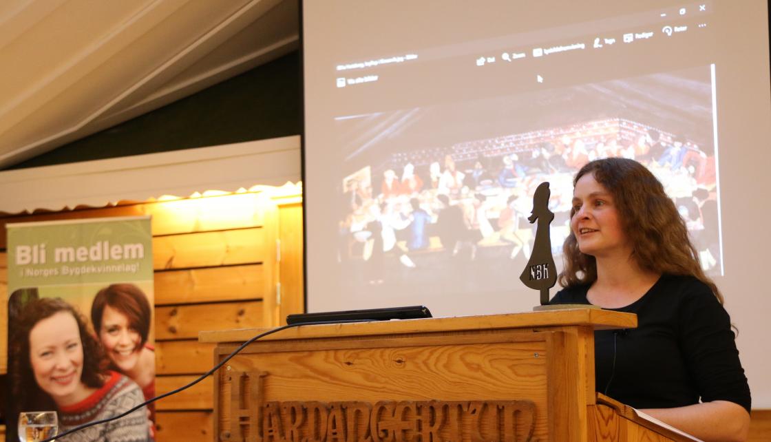 Sa gav Helene Olsen ordet til Agnete Sivertsen, føredragshaldar for årsmøteføredraget. Ho er styrar for Hardanger folkemuseum, og ho snakka om prosjektet «Hardangerskautet». Dette hovudplagget har vore brukt i Hardanger heilt sidan 1600-talet. No var det berre Ingebjørg Byrkjeland frå Steinsdalen i frå Kvam som kunne kunsten å fella skaut. Hardanger folkemuseum sette difor i gang med eit prosjekt for at denne kunsten ikkje skulle døy ut, men leva vidare. Det var interessant å sjå og høyra korleis dette skautet vert laga til. Me fekk sjå ein video der Ingebjørg Byrkjeland frå Steinsdalen fella skaut, og Agnete Sivertsen demonstrerte og kunsten for oss. Skautet er framleis mykje i bruk saman med Hardanger bunaden.