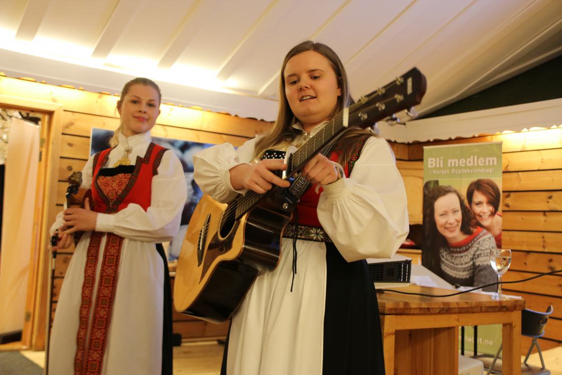 Etter middagen kom «FOLKELOKK» og spela og song for oss. To dyktige jenter med hardingfele og gitar og vakker sangstemme. Til takk fekk dei ei rose kvar og eit NBK-krus.