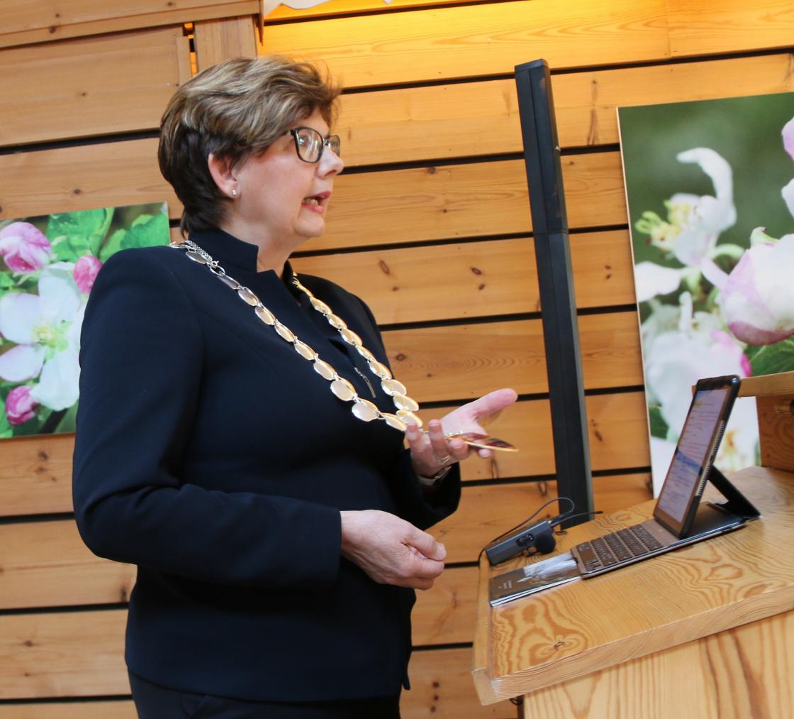 Vidare gav Helene Olsen ordet til ordførar Solfrid Borge som helsa frå heradet. Ho tok utgangspunkt i ordførarkjedet og det som det symboliserte. Ullensvang herad skal no slåast saman med Odda og Jondal, og dei står framfor mykje arbeid med det. Ho nemnde og arbeidsplassar dei har i heradet, ma ei avdeling av Statens Kartverk med 65 tilsette, 3. største avdeling i landet. Elles var ho innom eldreomsorg og meinte det var sjølvsagt at eldre på institusjon skal ha lokalt tillaga mat (dette medførte framlegg til resolusjon om dette seinare i årsmøtet). Ho nytta og høvet til å gje bort sin gamle vevgogn om nokon ville ha den.