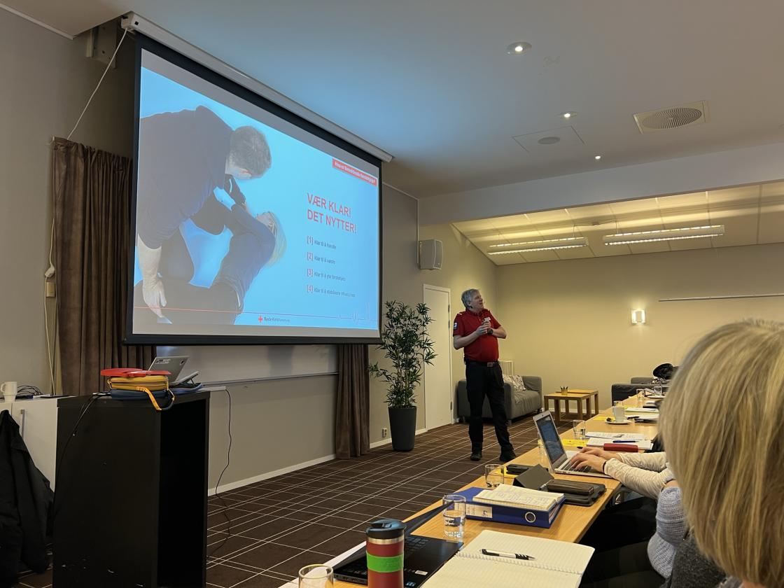 Så ble det Lunsj på hotellet, før videre program. Monika Frisvold Vågan fortalte nytt fra Norges Bygdekvinnelag og svarte på spørsmål fra salen. Så fikk vi en innføring i førstehjelp av Bård Tokle, som jobber i ambulansen på Åndalsnes og er med i Røde Kors.