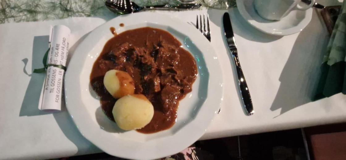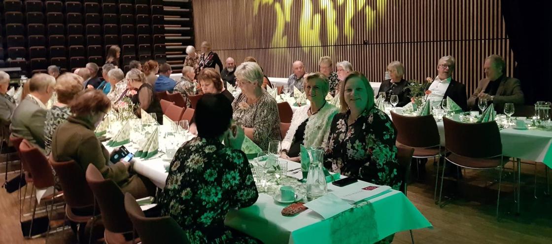 Aukra kulturhus var flott pyntet. God middag, sosakjøtt, riskrem, kaffe og kaker ble servert av