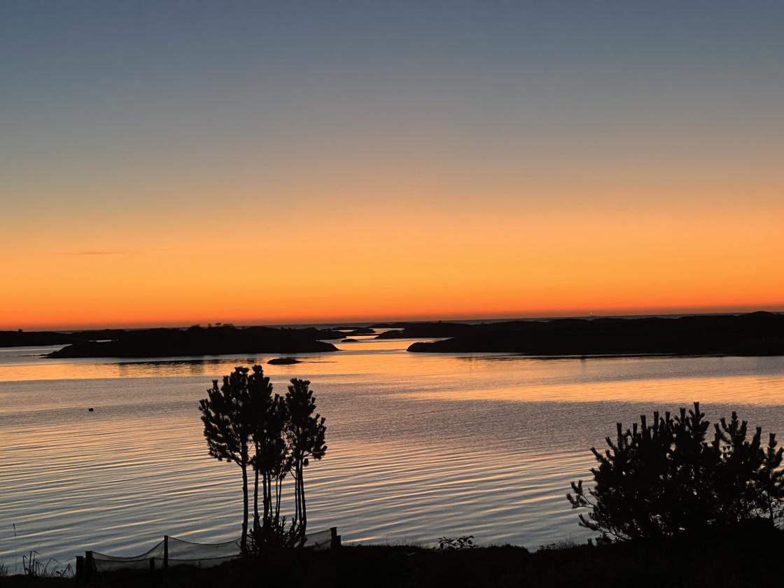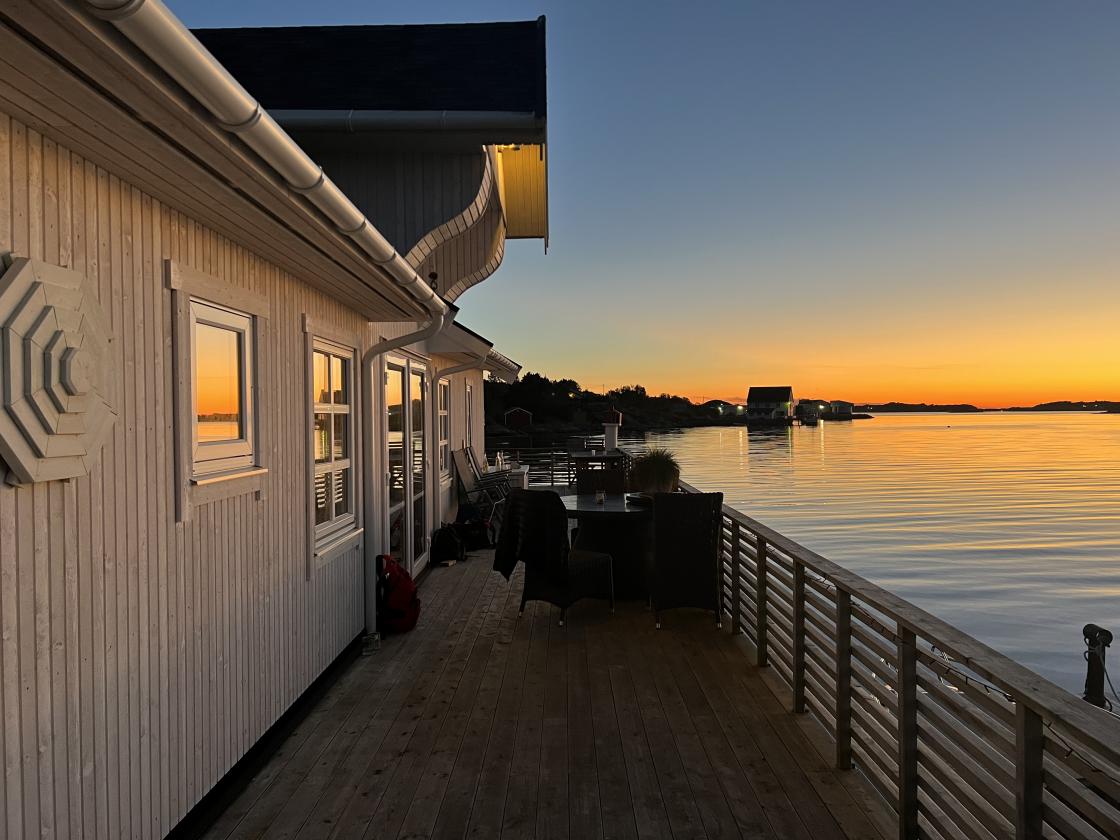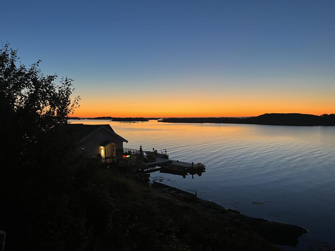 Dagen ble avsluttet ved ei privat brygge med fantastisk utsikt over solnedgangen på Gjenstøa.