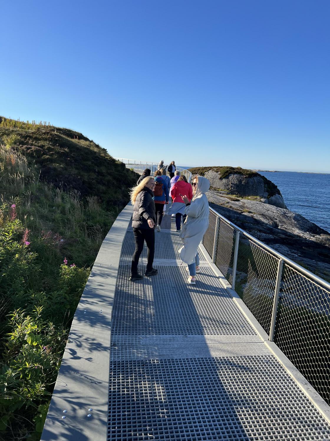 Turen gikk videre over Atlanterhavsveien, en fantastisk perle. Vi gikk også sveve stien, til stor glede for de vi hadde med oss. Solen skinte og vinden hadde pause, så de var helt overveldet over naturen vår.