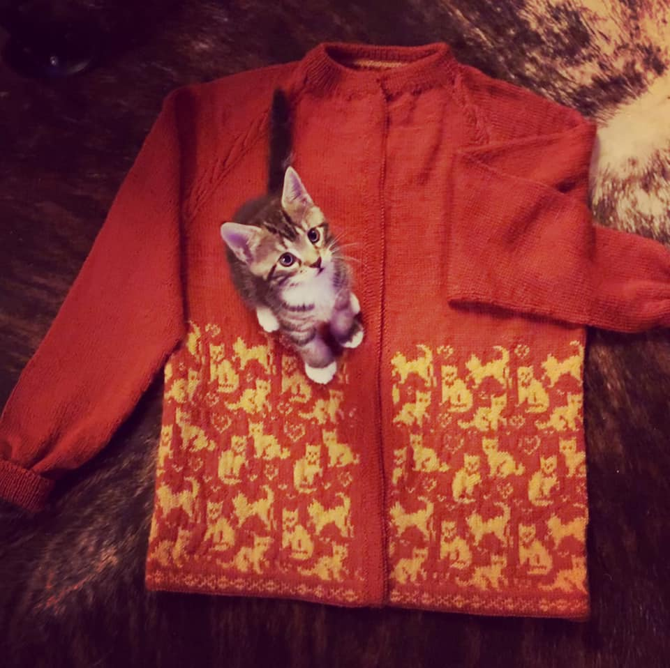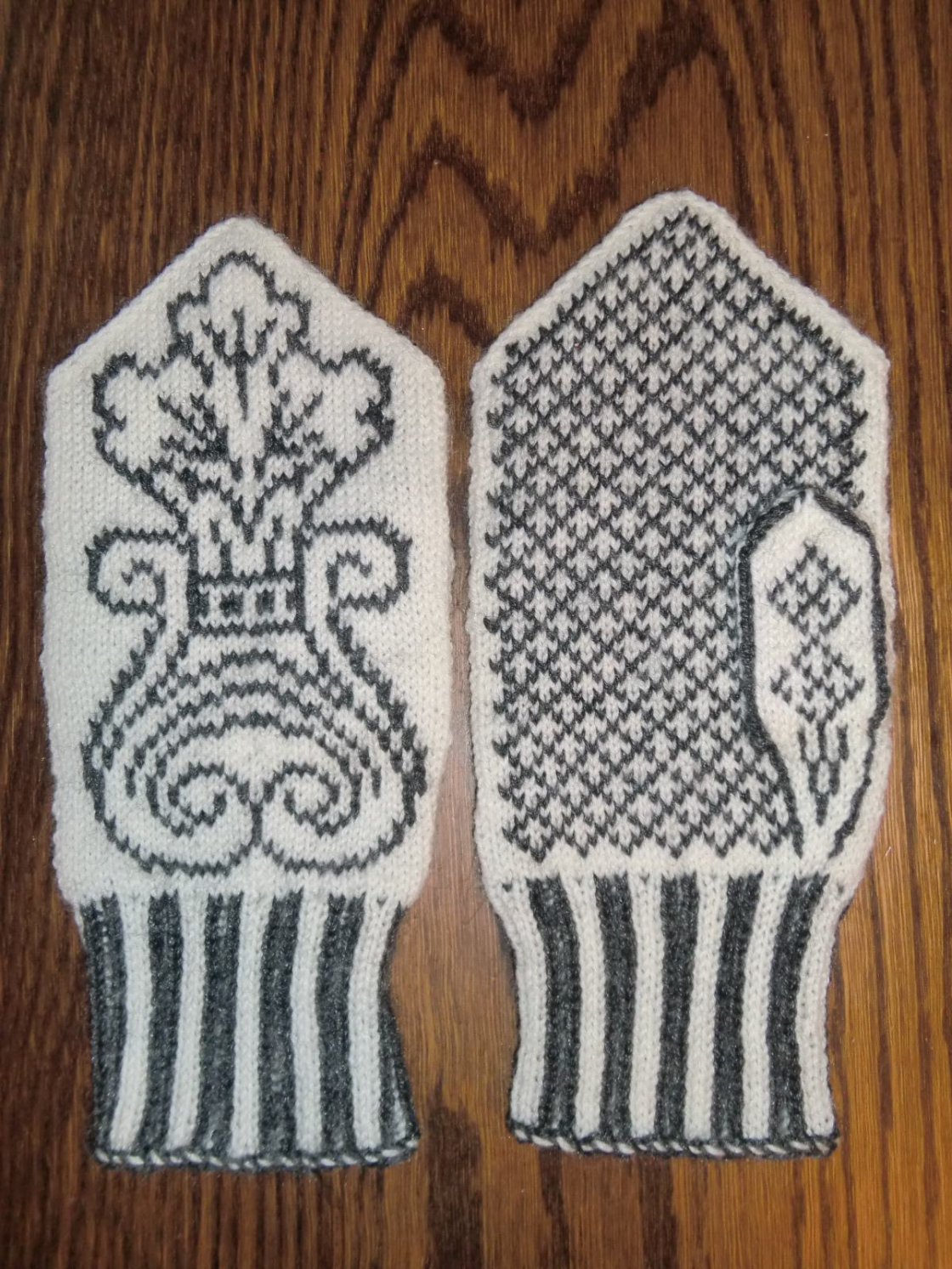 Sverre teikna ei akantus ranke, og Laila teikna om til mønster, og strikka votten.