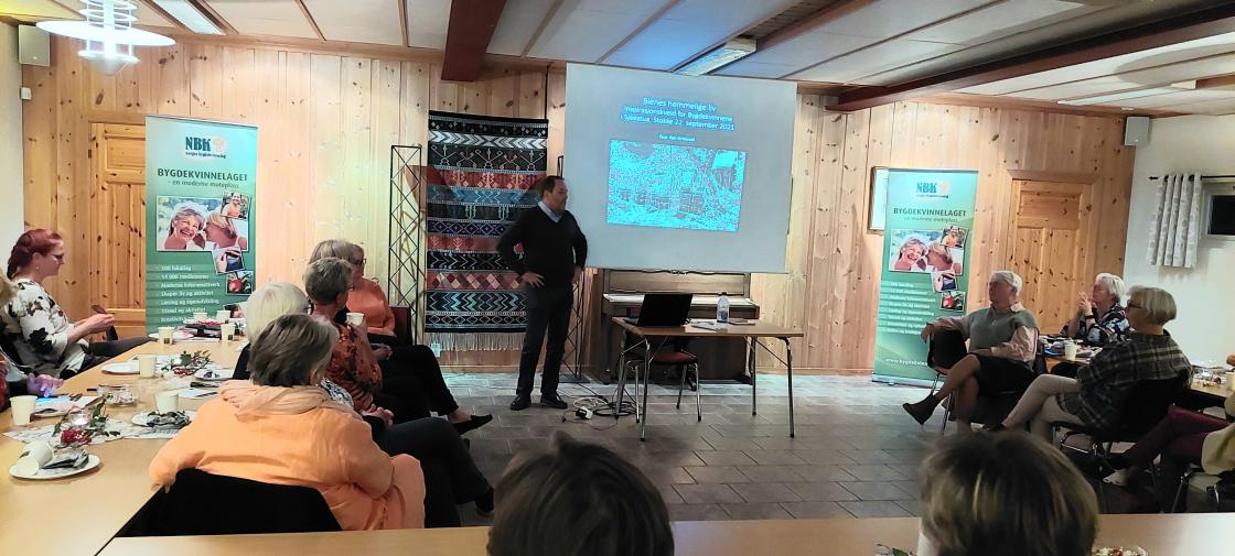 Birøkter og forfatter Roar Re Kirkevoll. Fortalte om bier og bi-røkting. Et bisamfunn består av en dronning, noen hundre hannbier (droner) og mange tusen arbeidsbier. Alle biene har sin spesielle oppgave i dette fascinerende samfunnet. Han hadde også mange gode historier og episoder som han fortalte med ett glimt i øyet.