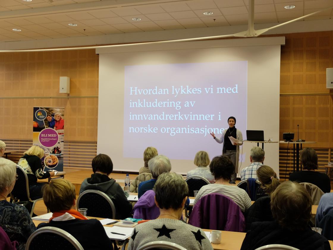 Fra foredraget hvordan kan Norges Bygdekvinnelag arbeide for å inkludere innvandrerkvinner? ved prosjektleder i DNT Havva Cukurkaya. Foto: Cesilie Aurbakken.