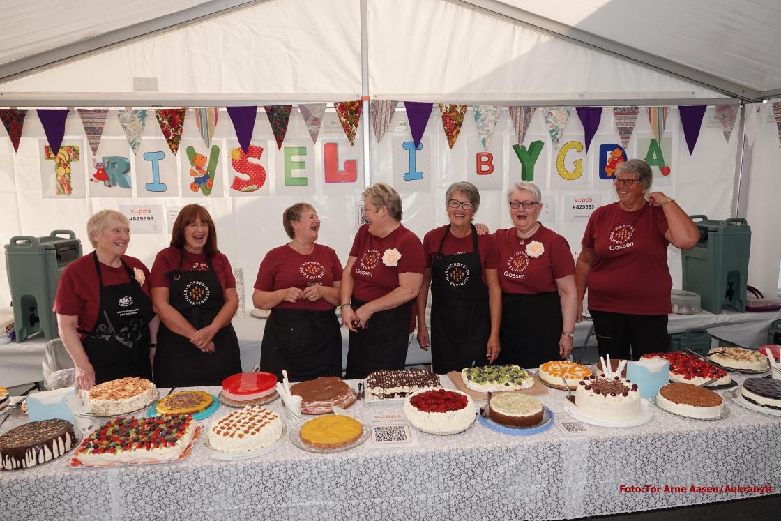 At smilande bygdekvinner selde rømmegraut, burgarar, pølser- og ikkje minst kaker fra årets kakebord med 52 kaker er alltid stor stas! Køa var stor også inne i kafeteltet! Festkaker av alle slag - her gjekk det unna!