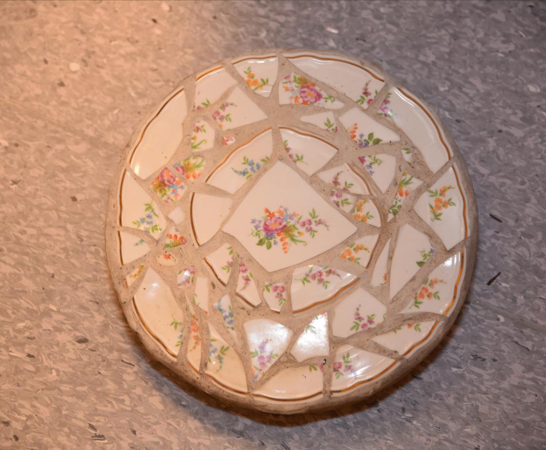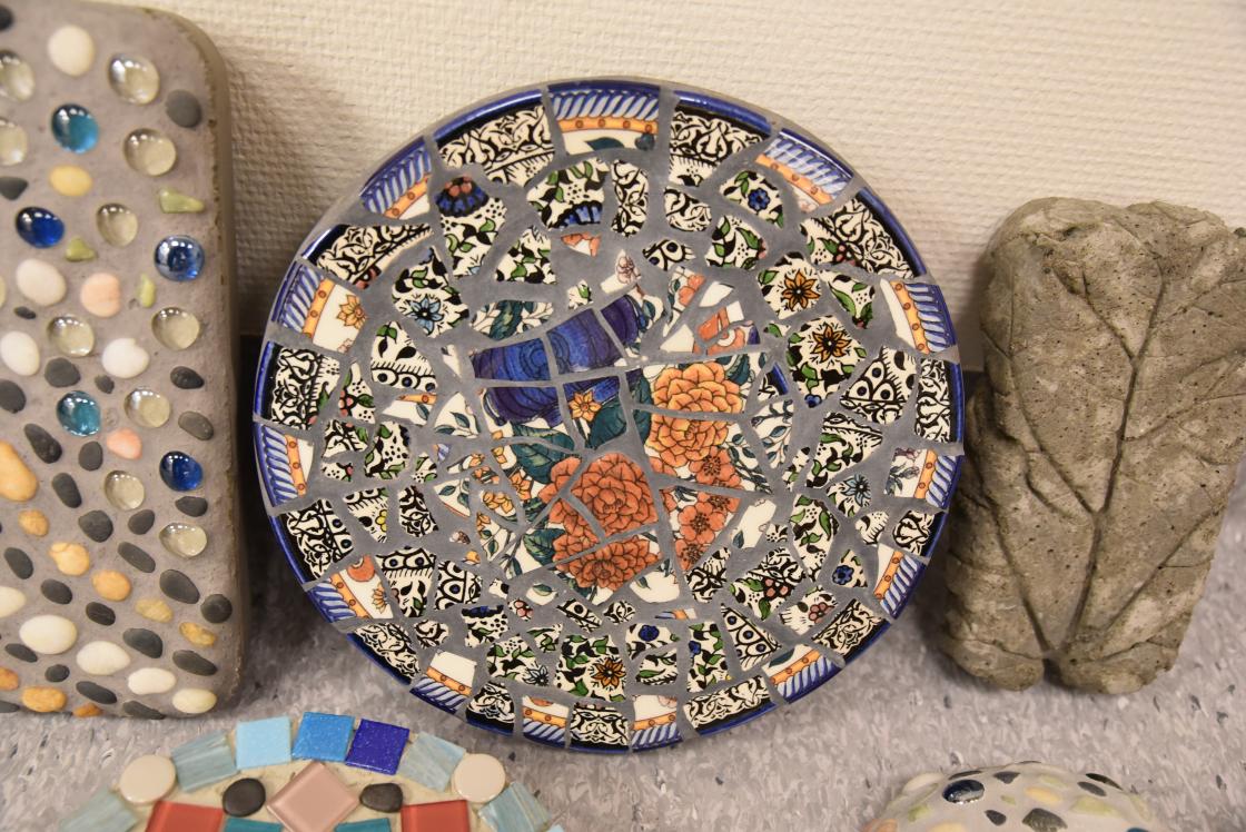Nå starter moroa. Hvilke materialer skal du bruke? Det kan være porselenskål, keramikk, fliser, glass fra stranda eller fine steiner. Prøveark med fliser i forskjellige farger, materialer og former kan du få kjøpt billig i flisforretninger. Styr unna skjell, de går fort i stykker, og glatte runde glassbiter løsner lett.