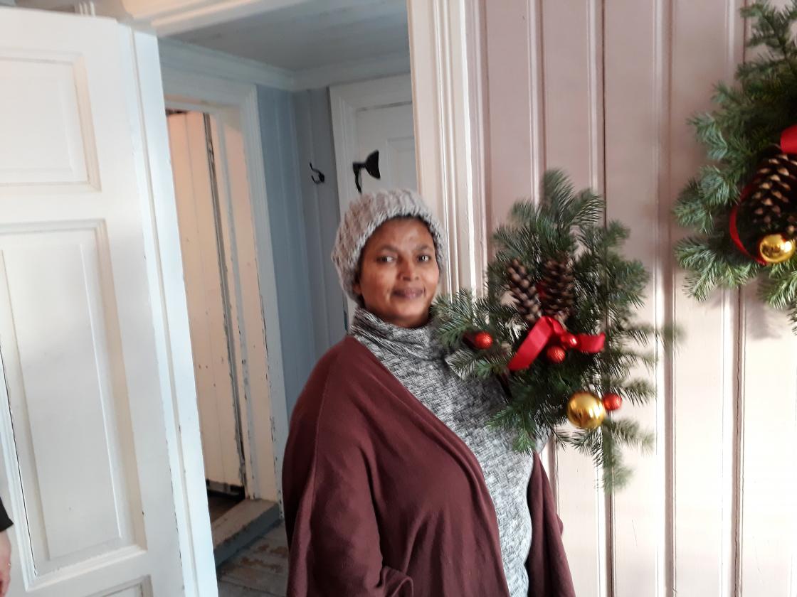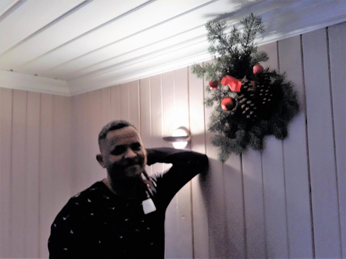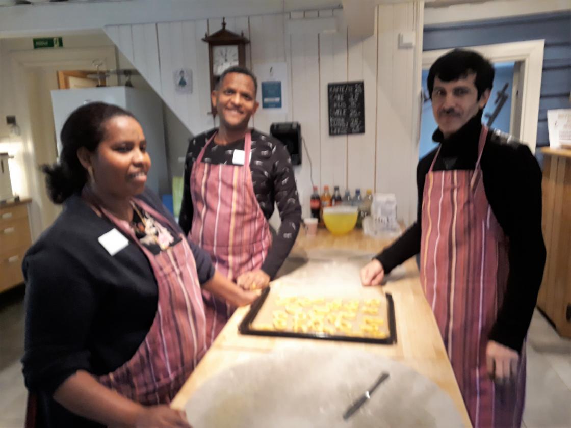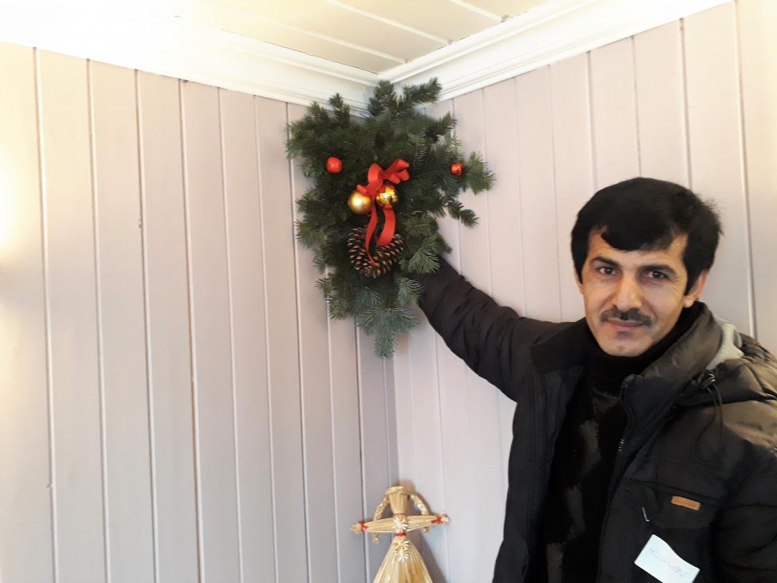 Mandag 10. desember kl. 8.30 hentet vi seks fra innvandrergruppen vår til juleaktiviteter på Bryggerhuset. Tre kvinner og tre menn skulle bake Berlinerkranser og lage dørpynt.I tillegg til fire entusiastiske bygdekvinner var lærer Karen med og Rose blomsterbinder var instruktør og hjalp oss med dørpynten.Gruppen vi har hatt kontakt med er positive, interesserte og aktive personer som det er trivelig å være sammen med. De fleste kan foreløpig ikke så mye norsk, men vi merker at ordforrådet blir bedre for hver gang vi møtes, og det er flott å oppleve.Stort sett klarer vi å komme til en felles forståelse ved å benytte alle former for kommunikasjon.