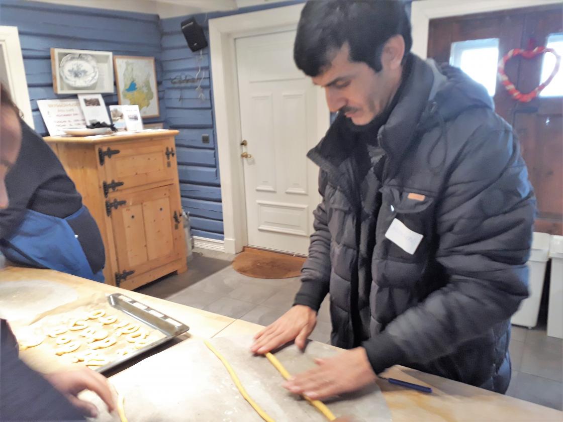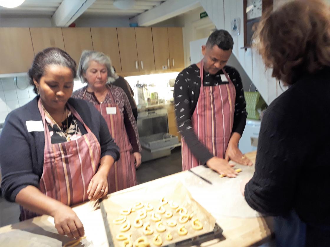 Deigen til Berlinerkransene var laget på forhånd, og utbakingen gikk som en lek. Ekstra kreativitet sto en av de mannlige deltakerne for, han introduserte en flettet utgave av kransene, som ble riktig fin når den ble stekt. Flere deltakere er fra Syria. Der er det ikke vanlig at menn baker, det er det kvinnene som gjør. En fortalte at dette var hans debut som baker. I tillegg til Berlinerkranser ble det også laget deig, og stekt kokosmakroner. Resultatet ble aldeles utmerket, og alle fikk med seg en en smak hjem.