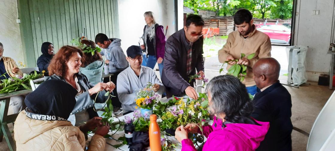 Binding av blomsterkranser - sommeravslutning med introduksjonsklassen ved Folkeuniversitetet