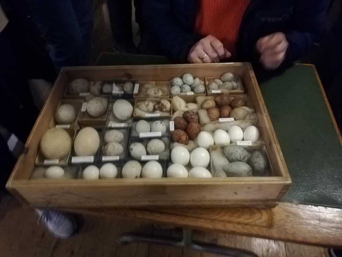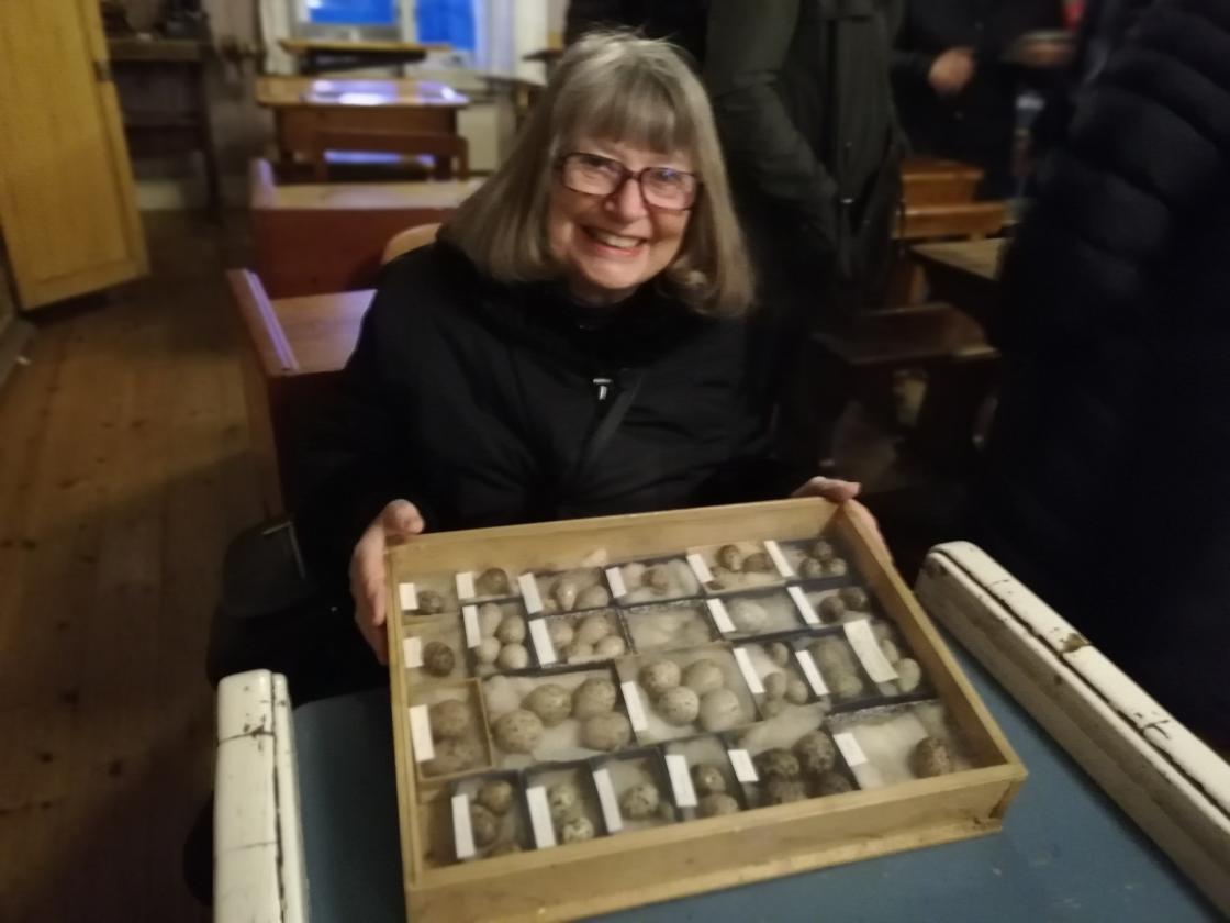 Etter dette ineressante bildeforedraget gikk vi over til den gamle skolestua. Grunnen til at vi hadde lagt møtet til Janløkka, er at i den gamle skolestua (bygget i 1844) finnes den en unik samlig av fugleegg. Her tok Anne Joronn Sæthre imot oss og lot oss få granske den enorme samlingen egg. Her var det alle størrelser fra store som erter til egg som var mye større enn et vanlig hønseegg!