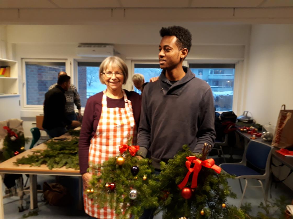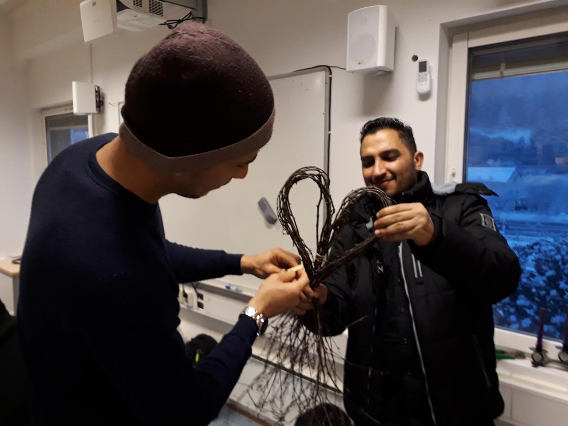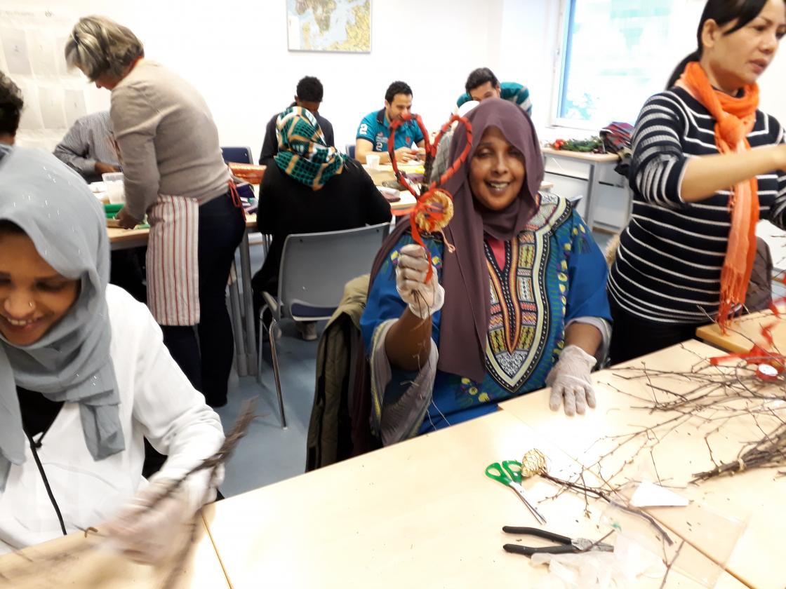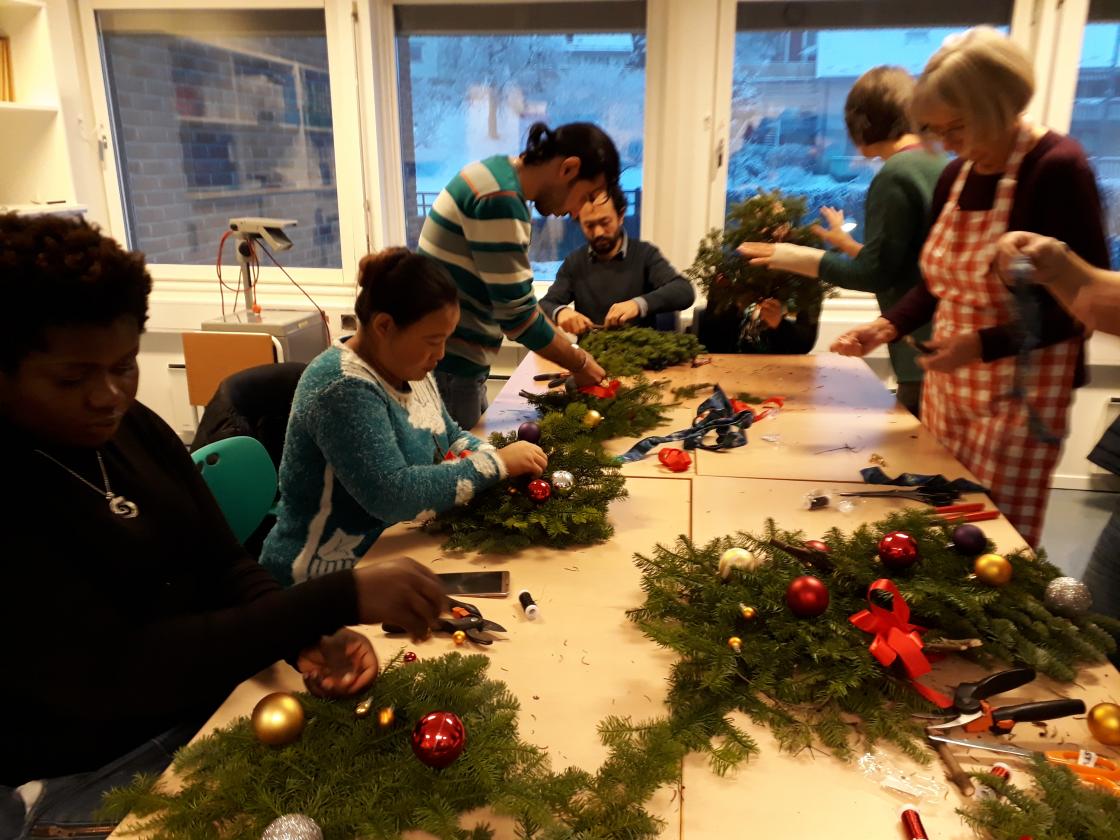 Denne onsdags morgen inntok vi lokalene til Folkeuniversitetet, med bjørkekvister, bar, kuler,kongler, bånd og annen pynt, glanspapir og krumkaker. Både kvinner og menn fra to av klassene på introduksjonskurset var med. Deltakerne som representerte mange nasjoner, ble delt inn i tre grupper. En gruppe laget hjerter av bjørkekvister, en laget dørpynt av bar, og i en gruppe ble det flettet julekurver. Gruppene rullerte slik at alle fikk prøve seg på de tre aktivitetene. Entusiasmen var stor, og som bildene viser ble det laget veldig mye fint av bar og kvister. Julekurver ble det ikke laget mange av. Her hadde vi for store grupper, for få hjelpere og for liten tid til å få laget ferdig kurvene. Etter tre timer med god innsats avsluttet vi med kaffe, krumkaker og noen norske julesanger, og to av kvinnene sang en sang fra Thailand. Alle sammen fikk med seg fin selvlaget julepynt hjem.