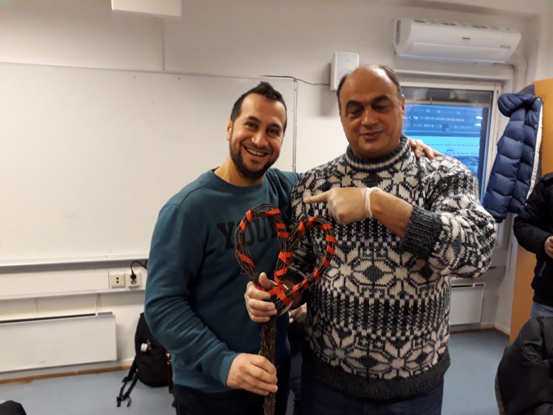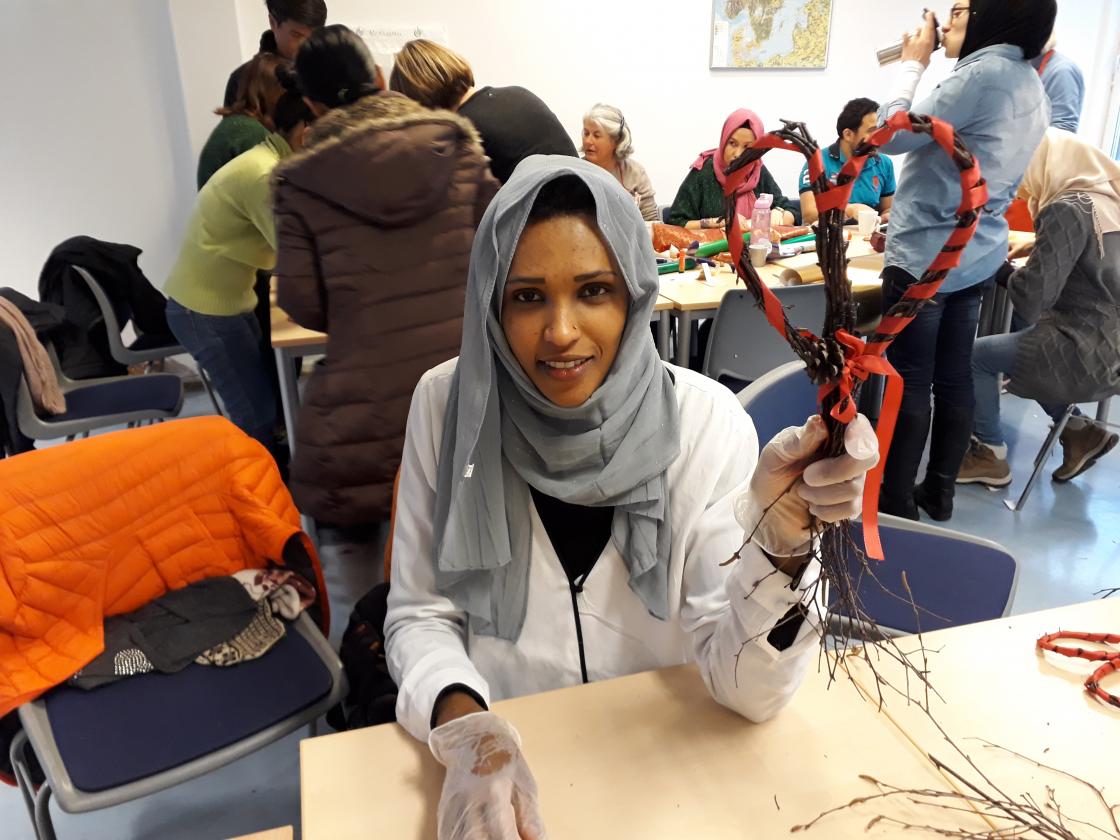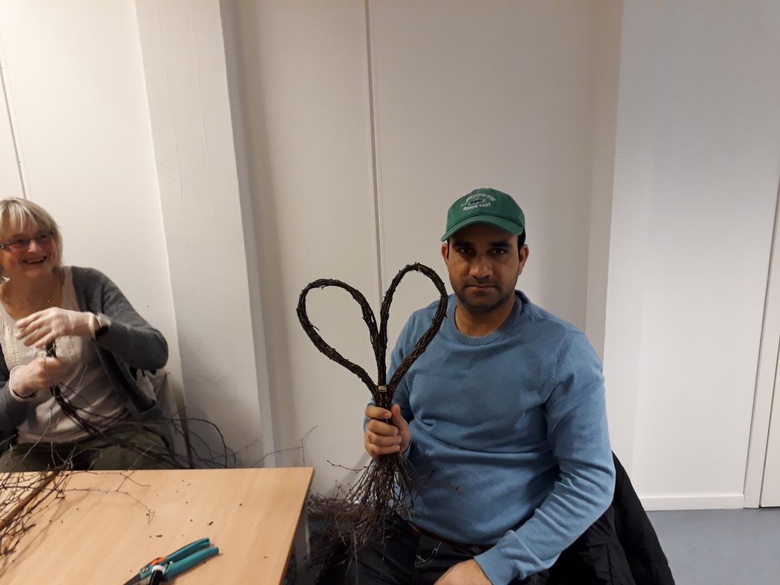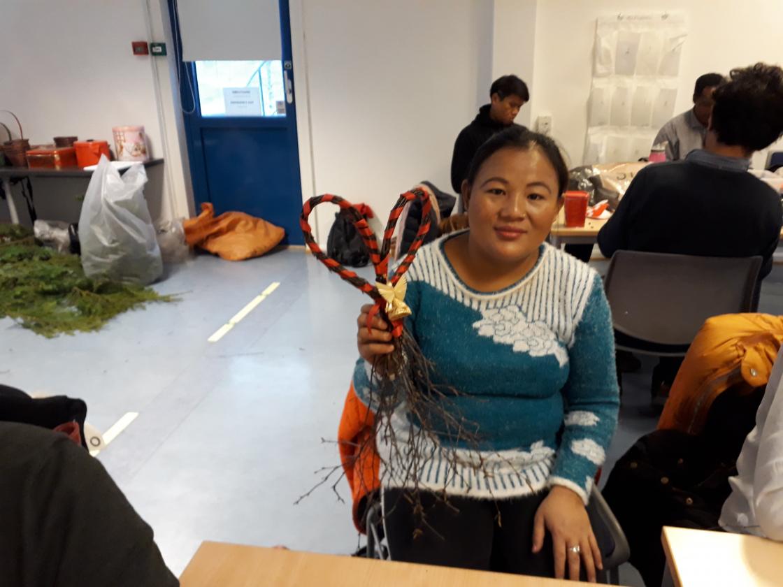 Denne onsdags morgen inntok vi lokalene til Folkeuniversitetet, med bjørkekvister, bar, kuler,kongler, bånd og annen pynt, glanspapir og krumkaker. Både kvinner og menn fra to av klassene på introduksjonskurset var med. Deltakerne som representerte mange nasjoner, ble delt inn i tre grupper. En gruppe laget hjerter av bjørkekvister, en laget dørpynt av bar, og i en gruppe ble det flettet julekurver. Gruppene rullerte slik at alle fikk prøve seg på de tre aktivitetene. Entusiasmen var stor, og som bildene viser ble det laget veldig mye fint av bar og kvister. Julekurver ble det ikke laget mange av. Her hadde vi for store grupper, for få hjelpere og for liten tid til å få laget ferdig kurvene. Etter tre timer med god innsats avsluttet vi med kaffe, krumkaker og noen norske julesanger, og to av kvinnene sang en sang fra Thailand. Alle sammen fikk med seg fin selvlaget julepynt hjem.