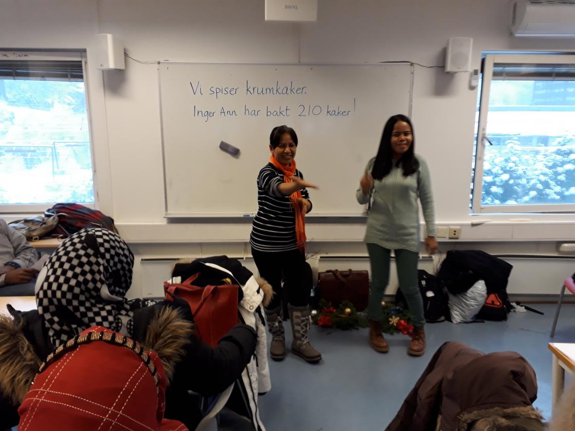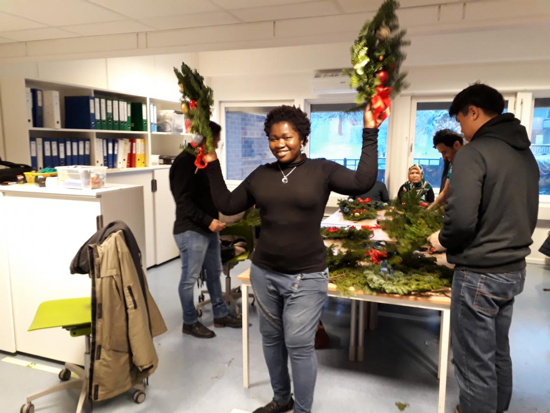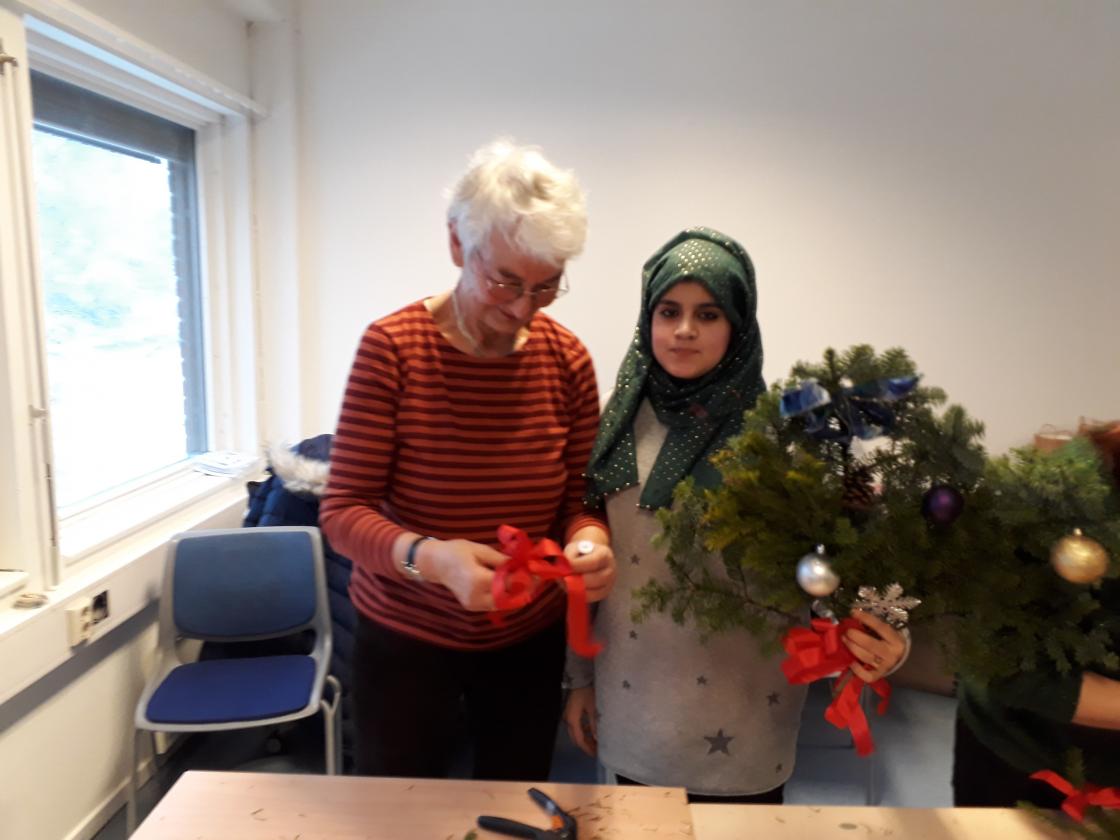I år er det 4.gangen vi arangerer juleverksted i samarbeid med folkeuniversitetet. Det er en veldig hyggelige, morsom og meningsfull førjulsaktivitet. Vi treffer så mange blide, interesserte og entusiastiske kvinner og menn, som virkelig ser ut til å stortrives med denne aktiviteten. De er på ulikt nivå når det gjelder språket, men det gjør ikke noe. Felles aktivitet er kontaktskapende og gir muligheter for en helt spesiell " samtale". Vi kommer fram til en felles forståelse gjennom å bruke enkle ord,vi viser hvordan ting skal gjøres, bruker mimikk og bevegelser. Mye latter blir det, og vi sørger helt sikkert for, at alle får med seg den norske juletradisjonen med å pynte utgangsdøren sin til jul.