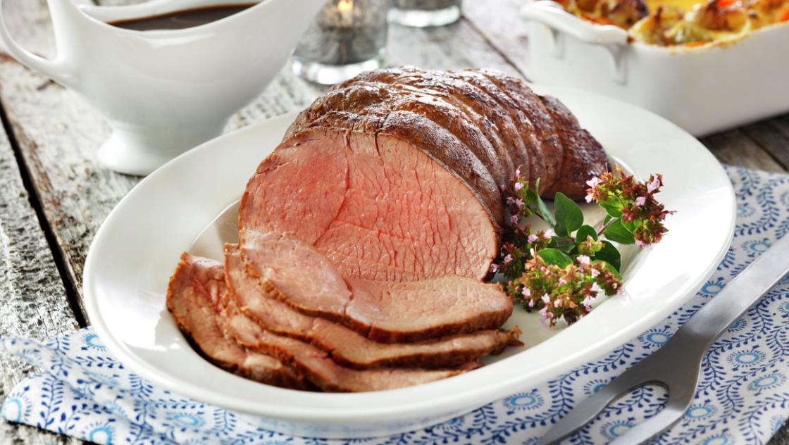 En roastbiff, ca. 2 kg, gnis inn med salt og pepper og stekes i ovnen. Kjøttet bør være litt rosa inni. Eidsvoldmennene fikk servert mye kalvekjøtt, men her bruker jeg storfekjøtt. Ellers sies det at de enestående menn fikk servert noe sur rødvin til maten; det prøver jeg å unngå.
