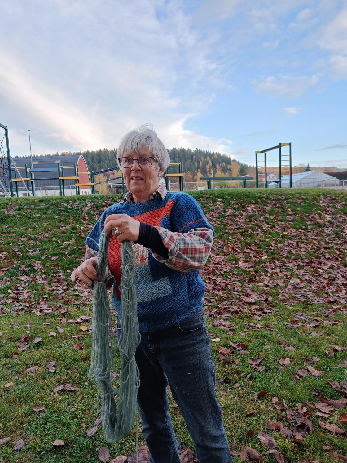 Den 16. oktober var dagen for selve soppfargingen. Jeanette fortalte litt om selve fargeprosessen mens vi alunbeiset garnet, slik at garnet ble klart til å ta opp fargepigmentene i soppen i fargebadene etterpå.