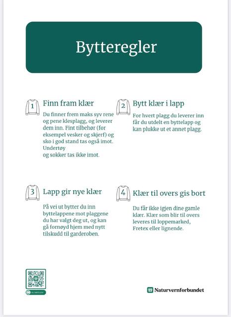 Ta med deg maks 7 rene plagg i god stand. For hvert plagg du leverer inn får du utdelt en klesbyttelapp og kan velge deg ut ett nytt plagg.
