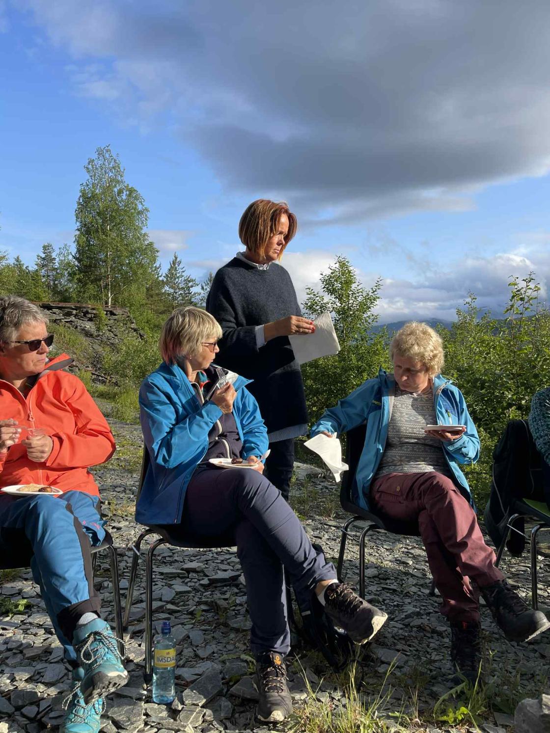 Tysdag 17.juni var siste kveldsturen for denne sesongen (kjem fleire turar til hausten). På tross av dårleg vervarsel fekk me, som tok turen til Hedleberget, ein eventyrleg kveld med kulturvandring, matservering i det fri og kulturhistorie frå Hedleberget. På førehand fekk me leiga Songvehytta grunna fare for vind og regn, men sola titta etter kvart fram bak skyene, slik at me kunne sitta ute og nyta sommarkvelden.