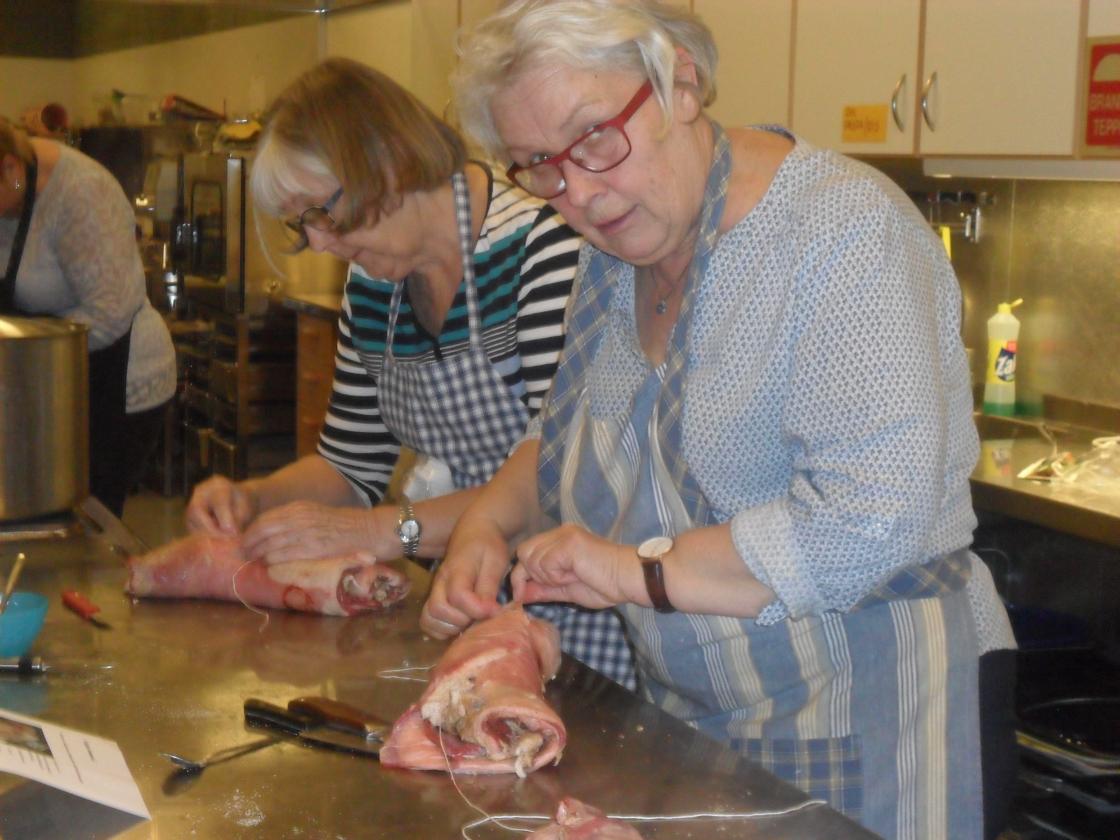Med hjelp av Hege Glad ble det laget 12 lammeruller på Kvernhuset ungdomsskole i kveld. Det ble kokt kraft på ribbeina, og med grønnsaker oppi ble det en skikkelig kosestund med suppe når vi var ferdige. Vi gleder oss til deilig pålegg til påske!