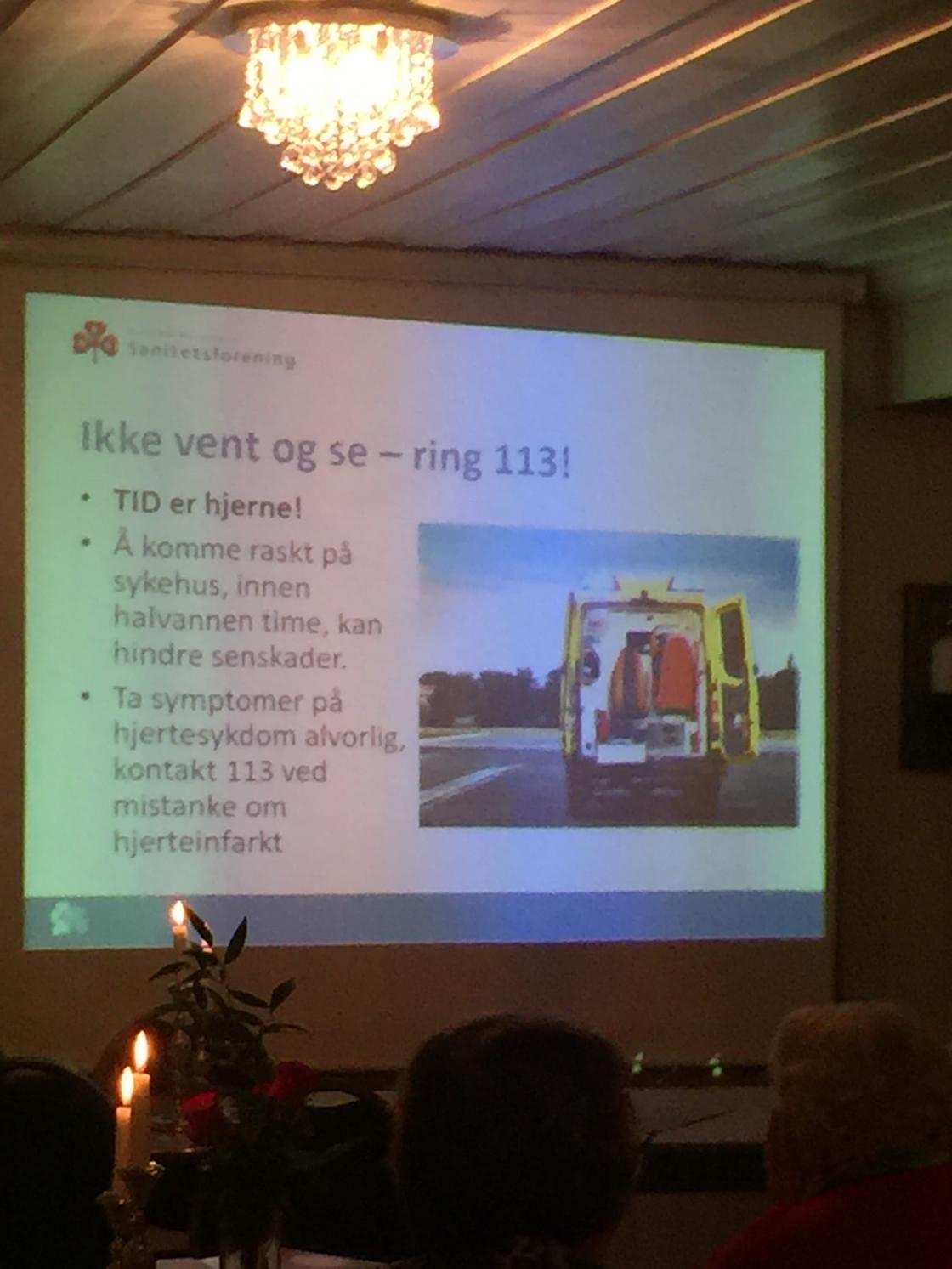 Hun tok spesielt for seg HJERTEINFARKT OG HJERNEINFARKT. I tillegg til snakke om temaet viste hun to videosnutter. Det var interessant å høre på henne, og noen fikk nok en påminnelse om at det er ikke dumt å ta en årlig sjekk hos legen.
