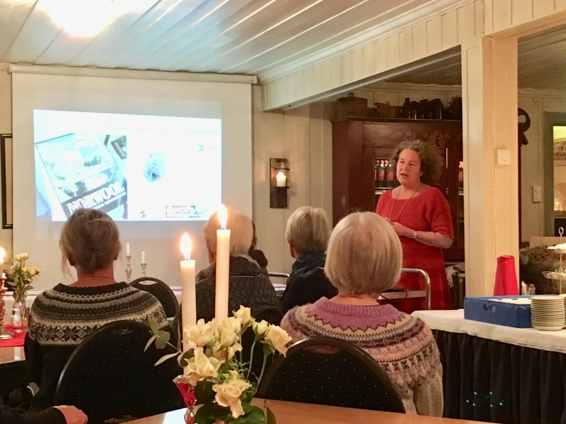 Hun holdt et interessant og lærerikt foredrag om de forskjellige saueartene vi har i Norge og bruken av deres ull. Vi som var på møtet lærte mye om hvordan ull fra norsk sau kan brukes, og ikke minst at dette garnet er sterkt og gir strikkeklær som holder i mange år.