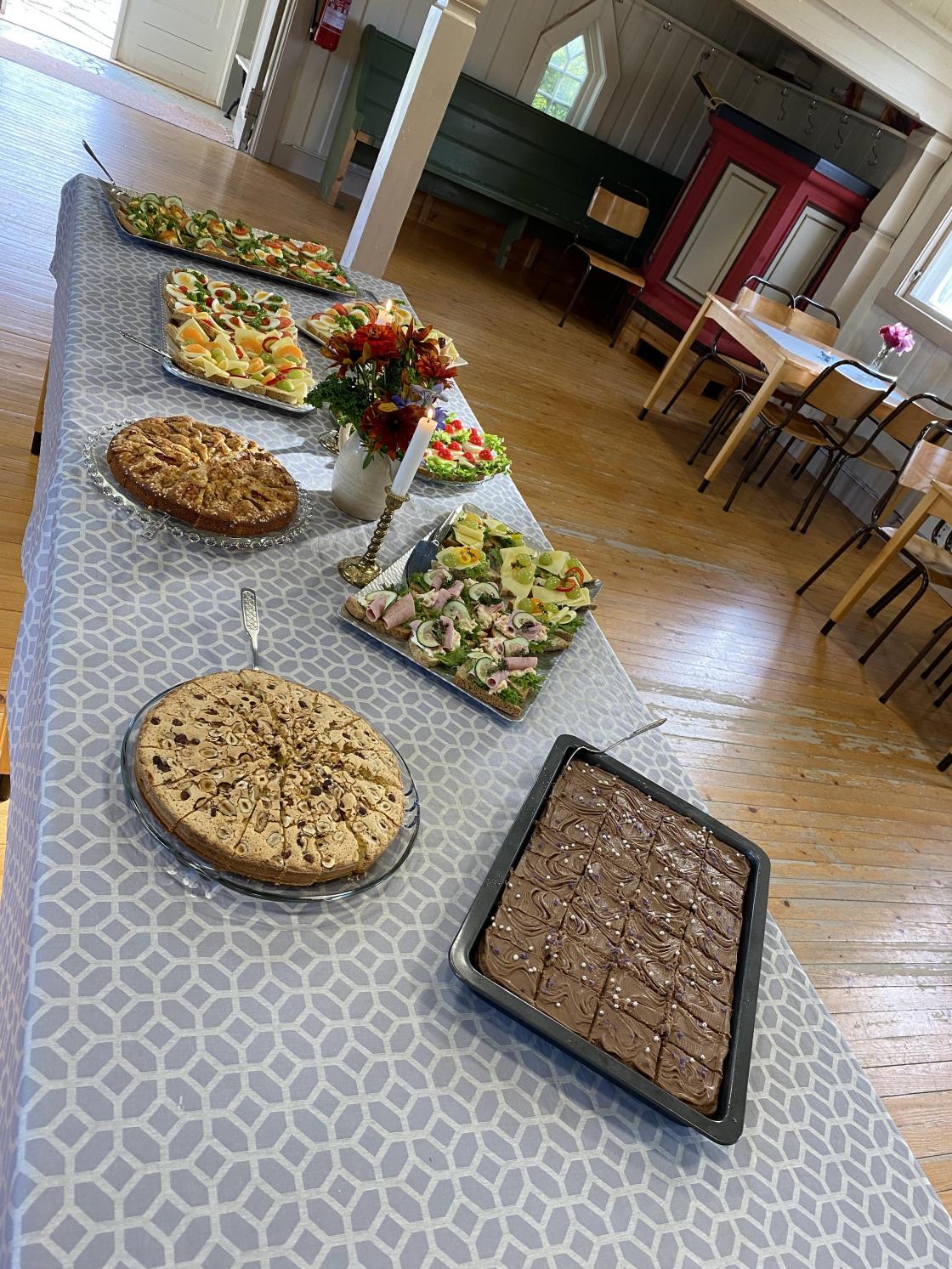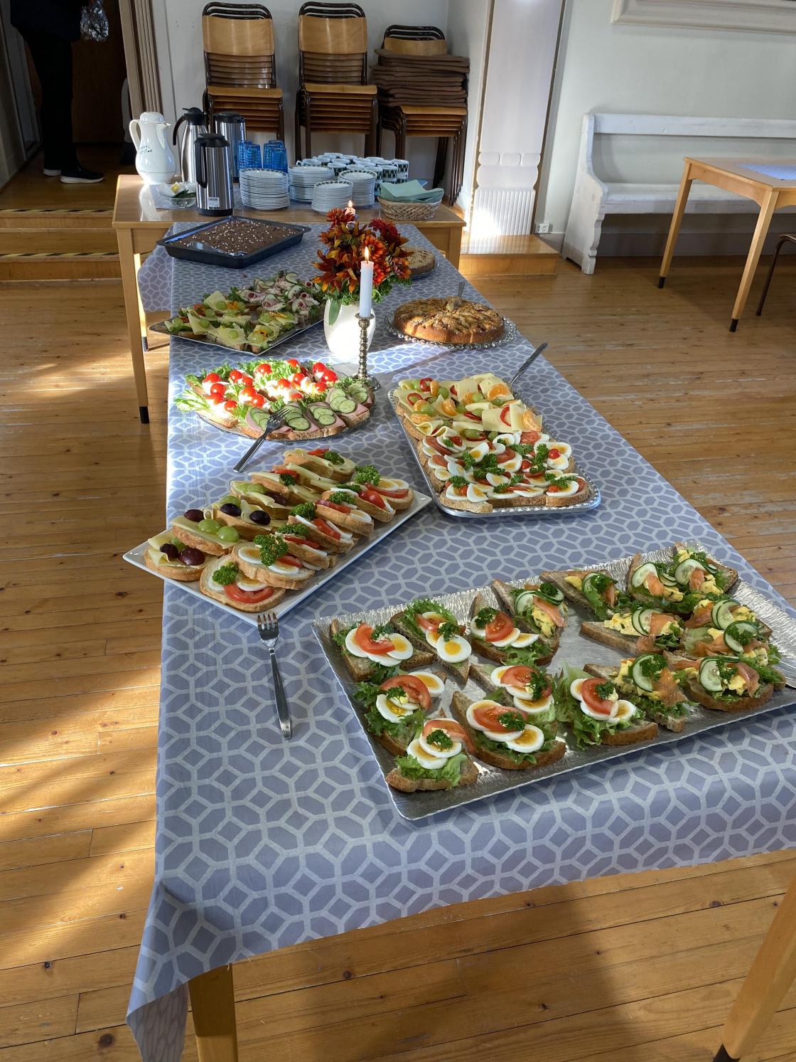 Noen av medlemmene hadde smurt deilige smørbrød og kaker som kirkefolket fikk servert etter gudstjenesten. Det så ut til å falle i smak hos både store og små. Kirkestua var nesten fullsatt.