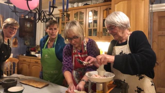 Vi var 7 damer fra Brandval bygdekvinnelag som fikk opplæring i hvordan vi kan lage våre egne julepølser på kjøkkenet hos Anne Marie. Hun hadde kjøpt inn svinebog, medisterfarse, krydder og tarmer som skulle benyttes, og instruerte oss i hvordan pølsene skulle lages.