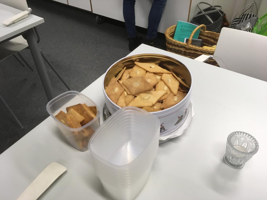 Det er lagets medlemmer som skal bake kakene, og for at de som ønsket det kunne være sammen om å bake noen av de tradisjonelle småkakene leide vi skolekjøkkenet. 7 bygdekvinner møtte opp, og det ble bakt goro, sandkaker, krumkaker og nøttetopper. Ei hadde med sirupssnipper som hun hadde stekt hjemme. Kakene ble lagt i plastbokser som laget har kjøpt inn, slik at de var klare for salg. Det er flere som vil bake kakene hjemme, så vi håper på mange kakebokser på julemarkedet.