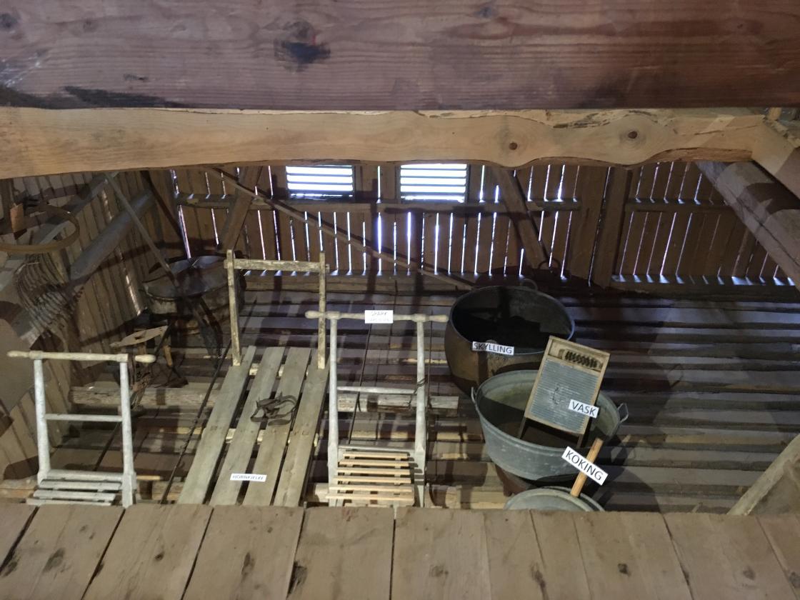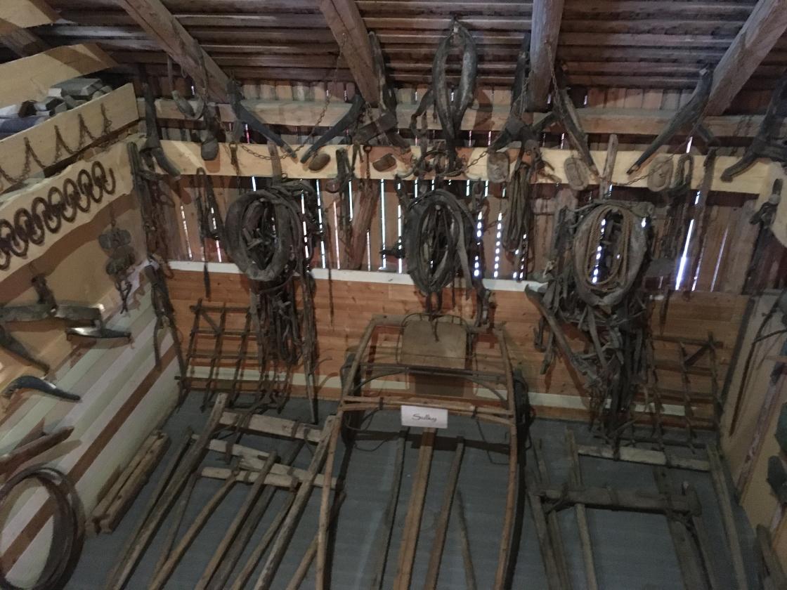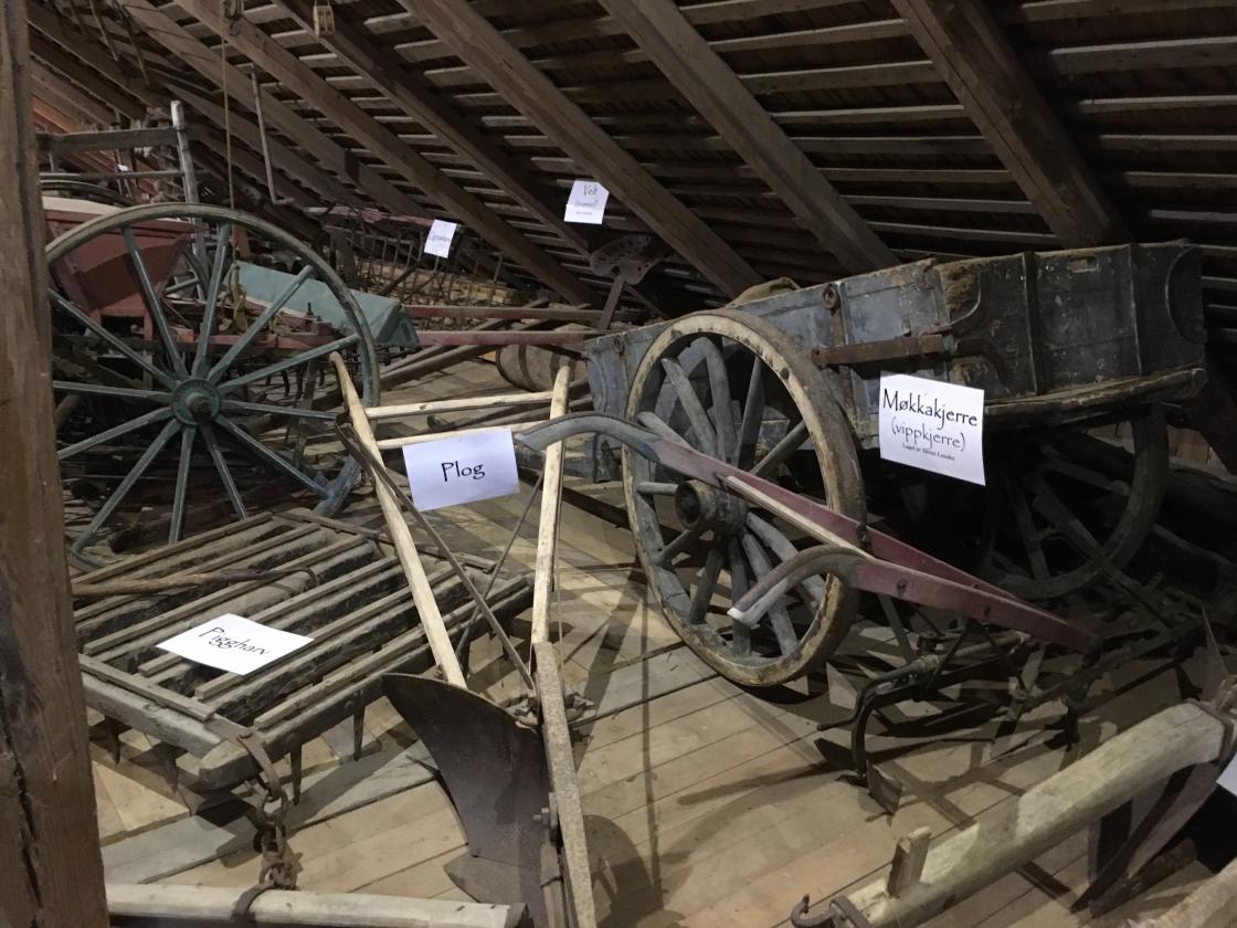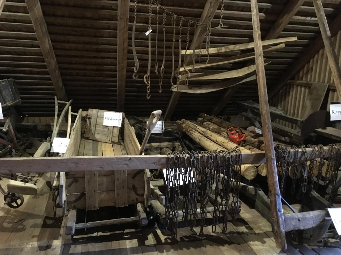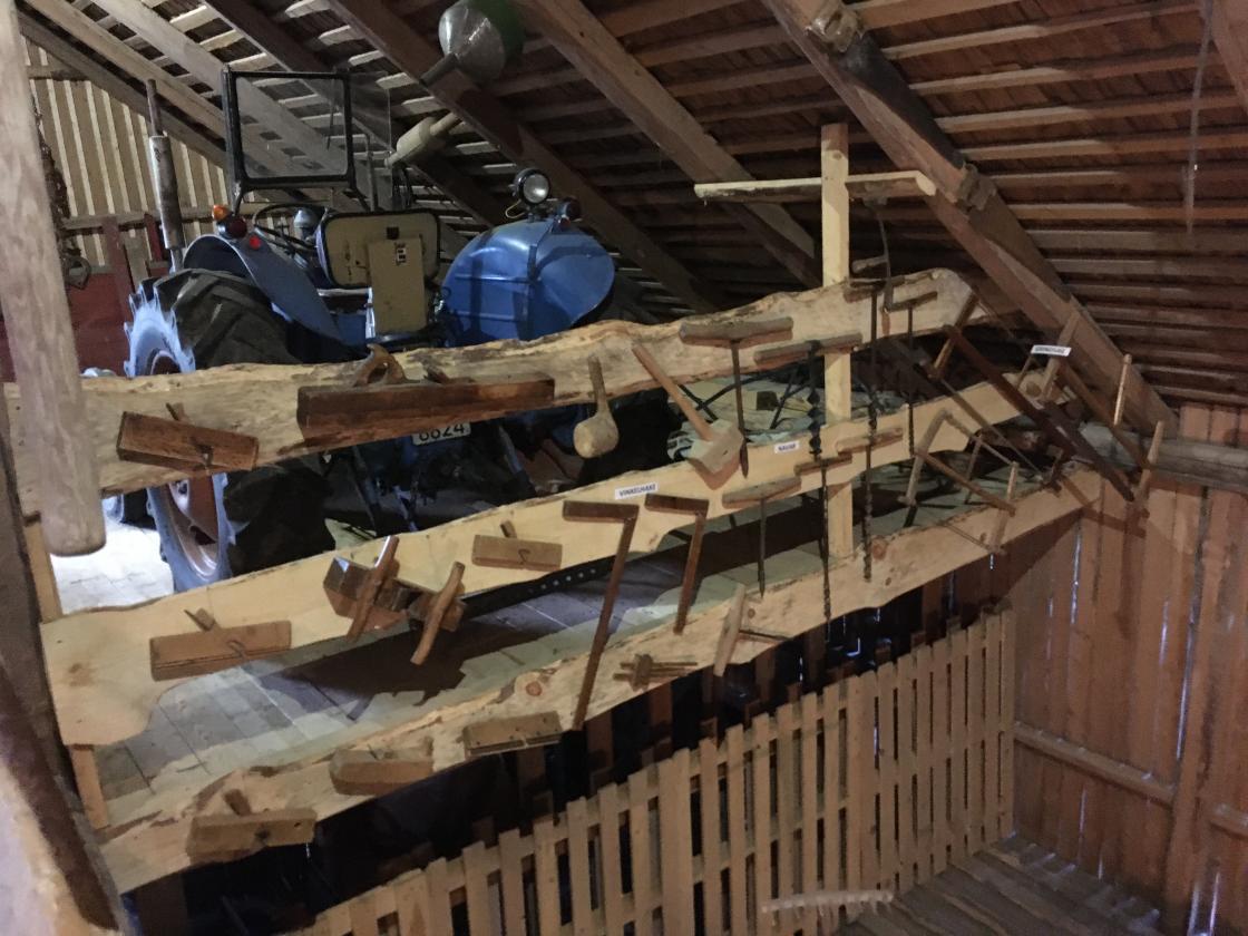 Så var det tid for omvisning. Jan fortalte litt om historien rundt dette gardsmuseet. Det startet med at et barnebarn ønsket å feire sin konfirmasjon oppe på låven. Det kunne ikke farfar si nei til, så da satte han i gang med å bære ut gammelt høy og gammel redskap m.m. før han tok fatt på støvsuging av gulv, vegger og tak. Gjenstandene ble vasket/spylt, og båret inn på låven igjen. Der ble de plassert i grupper ut fra hva de ble brukt til: jordbruksredskaper, skomakerverktøy og skogsarbeiderutstyr m.m.