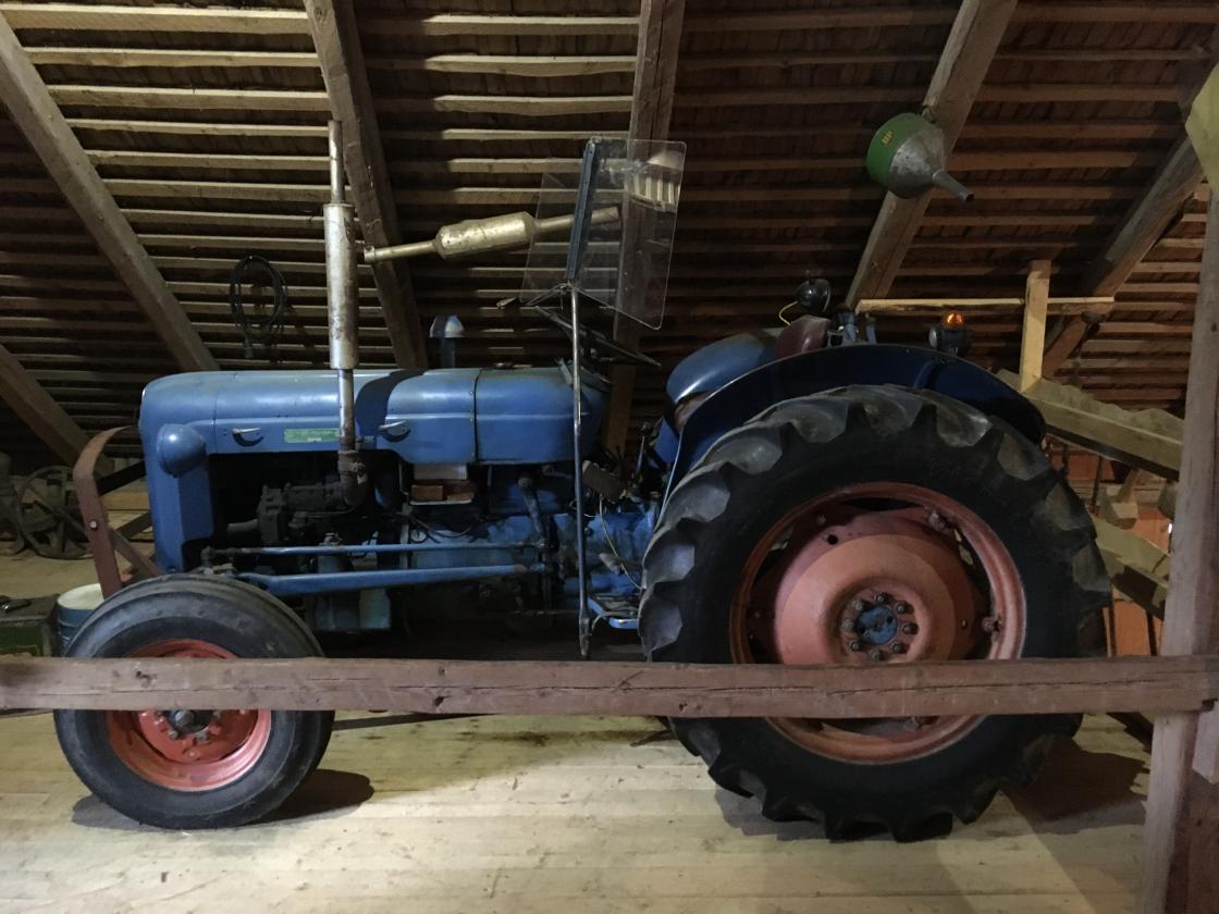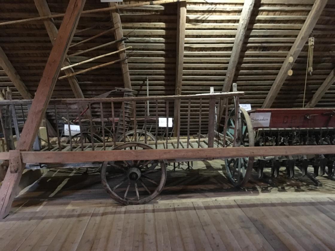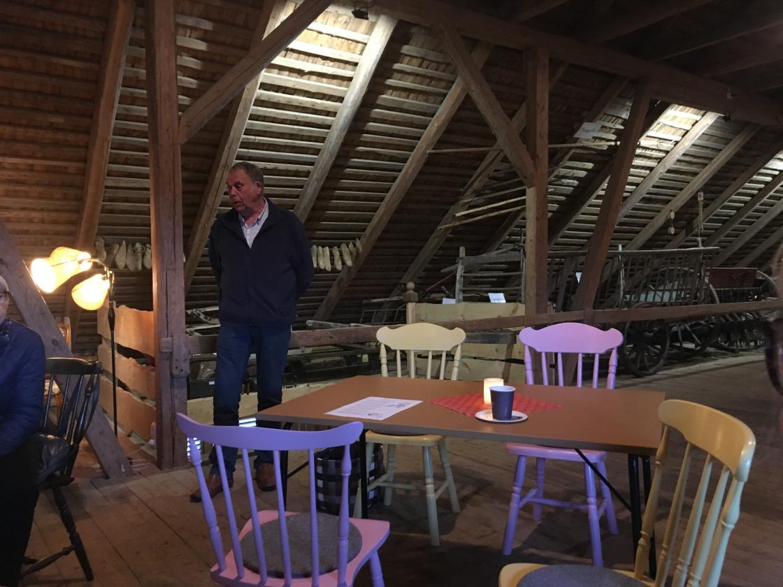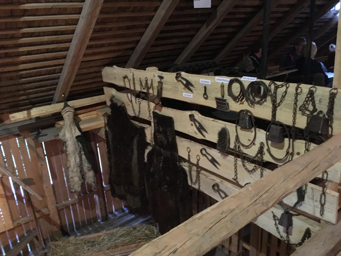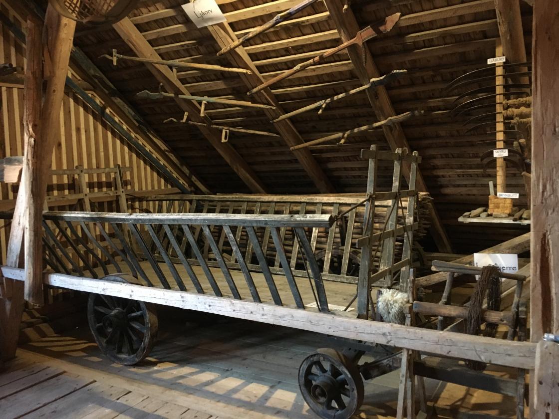 Så var det tid for omvisning. Jan fortalte litt om historien rundt dette gardsmuseet. Det startet med at et barnebarn ønsket å feire sin konfirmasjon oppe på låven. Det kunne ikke farfar si nei til, så da satte han i gang med å bære ut gammelt høy og gammel redskap m.m. før han tok fatt på støvsuging av gulv, vegger og tak. Gjenstandene ble vasket/spylt, og båret inn på låven igjen. Der ble de plassert i grupper ut fra hva de ble brukt til: jordbruksredskaper, skomakerverktøy og skogsarbeiderutstyr m.m.