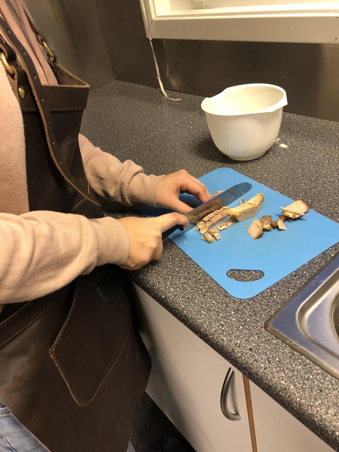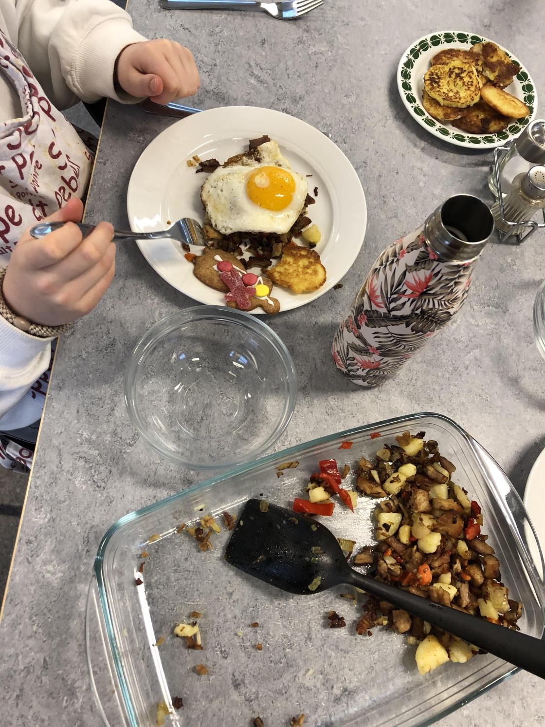 Så fikk elevene være med å lage pletter av poteter og pytt i panne av kokte poteter, ribberester, løk og paprika. I tillegg stekte de speilegg til å ha på toppen.