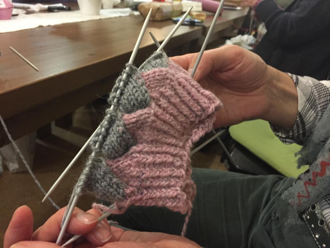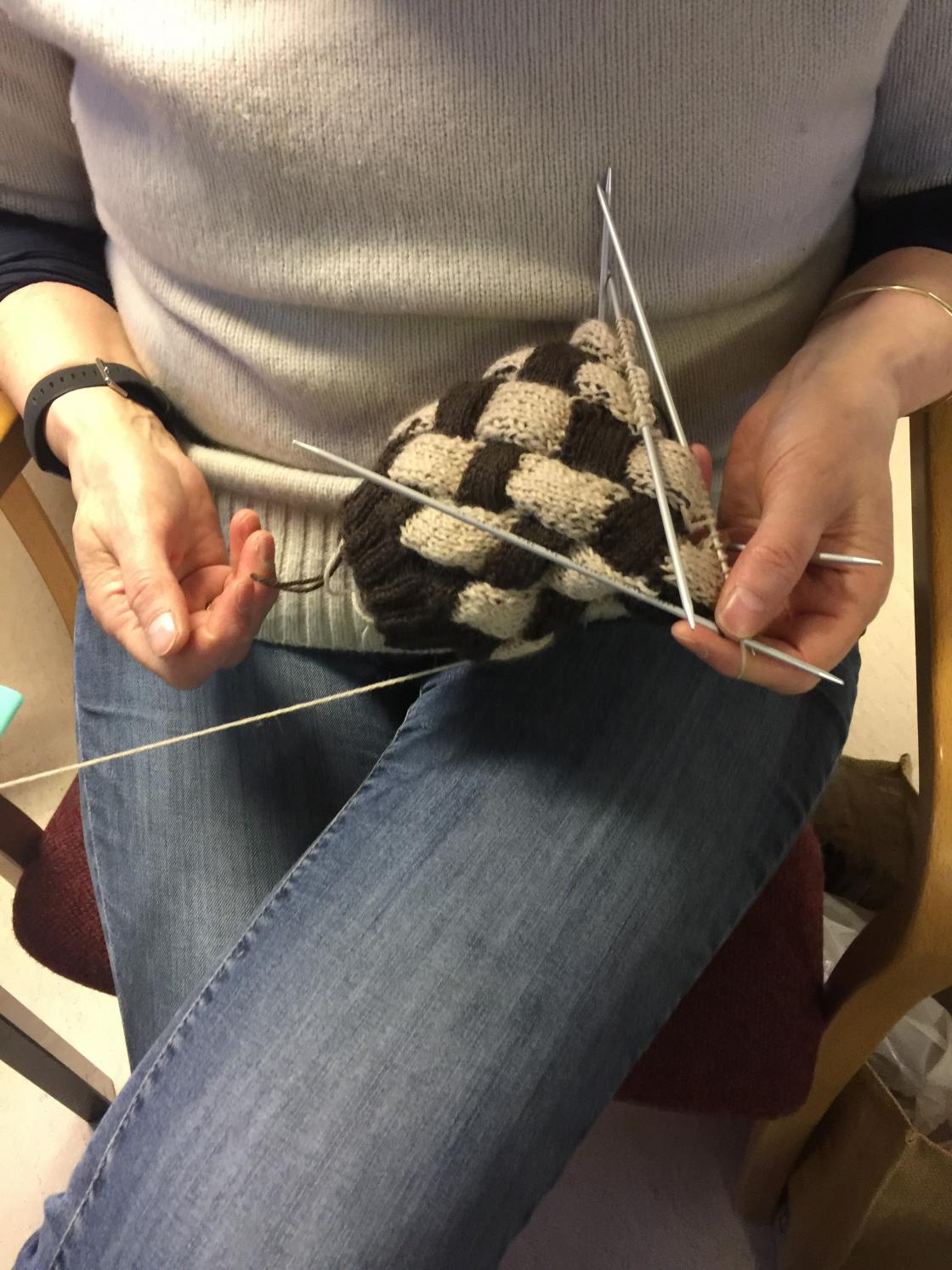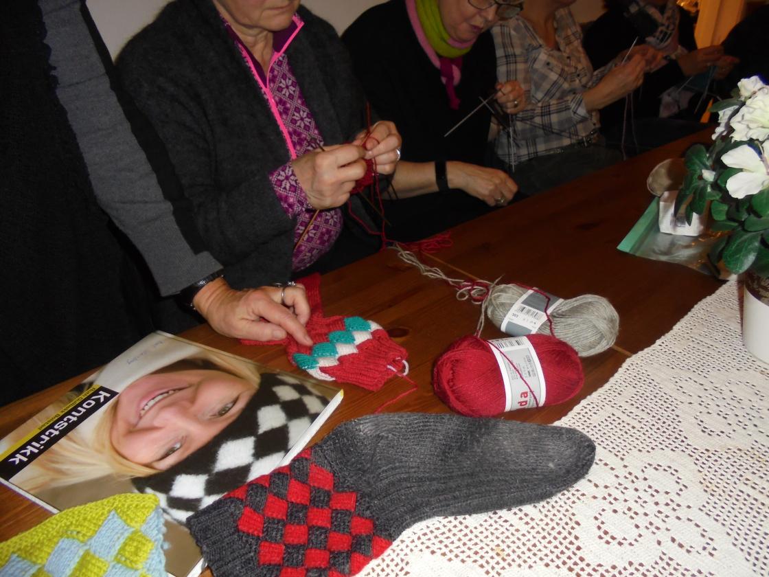 De som ønsket å lære kontstrikking samlet seg ved et bord, og Margit Foseid tok på seg jobben som læremester. Det var en ivrig gjeng som strikket i vei. Litt opprekking og maskeslipping ble det, og vi var enige om at det var vanskelig å kombinere prating og kontstrikking. Det var moro å lære denne strikkemetoden. Jeg vil tro at flere av oss ikke nøyer seg med å strikke bare ett par sokker.