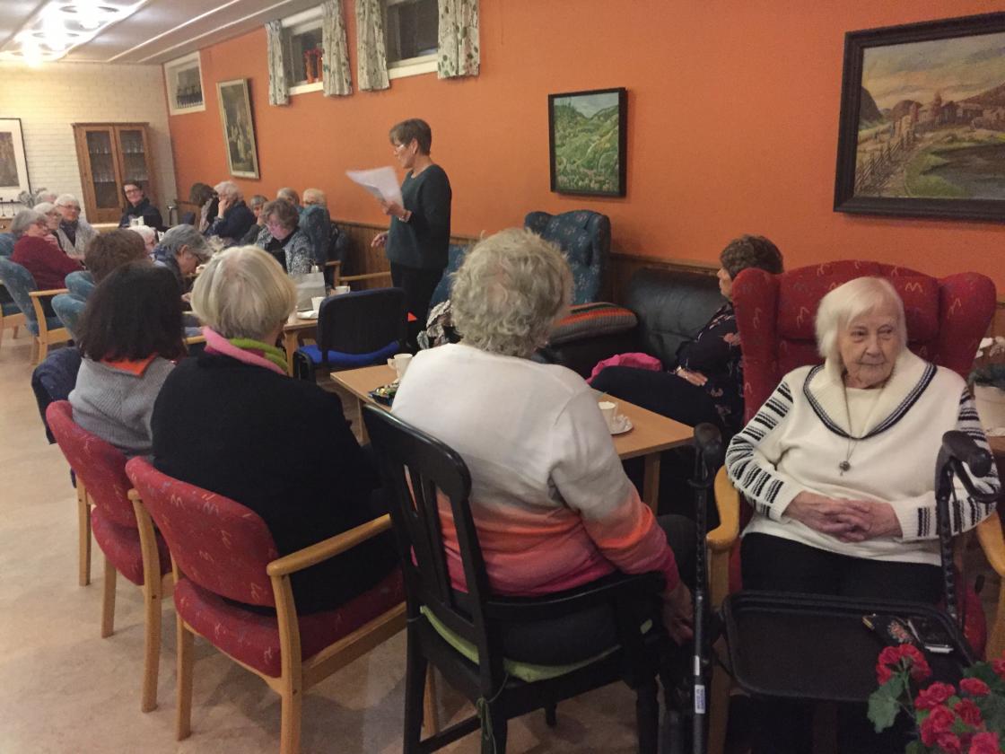 Det var mange bygdekvinner som ville "besøke" Kari som er en av våre to æresmedlemmer. Vi var 32 damer som møtte opp, og Kari var som alltid blid da hun tok imot oss i fellesrommet i underetasjen på Holt.