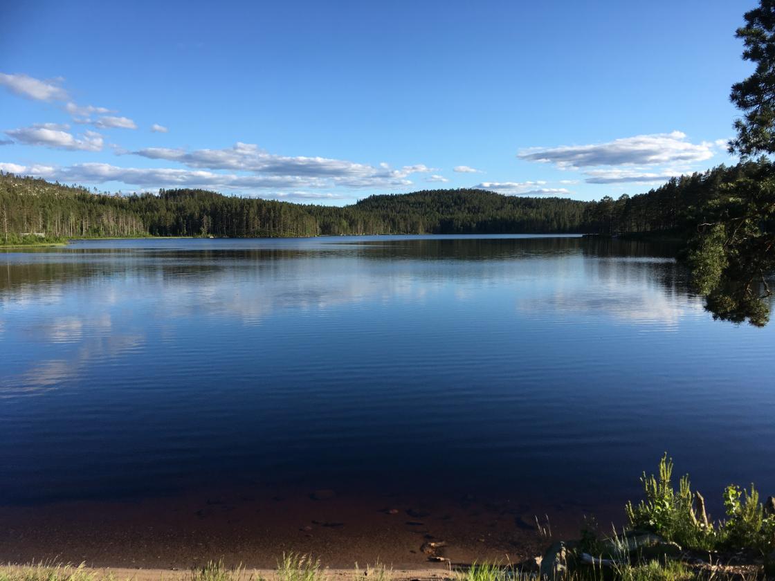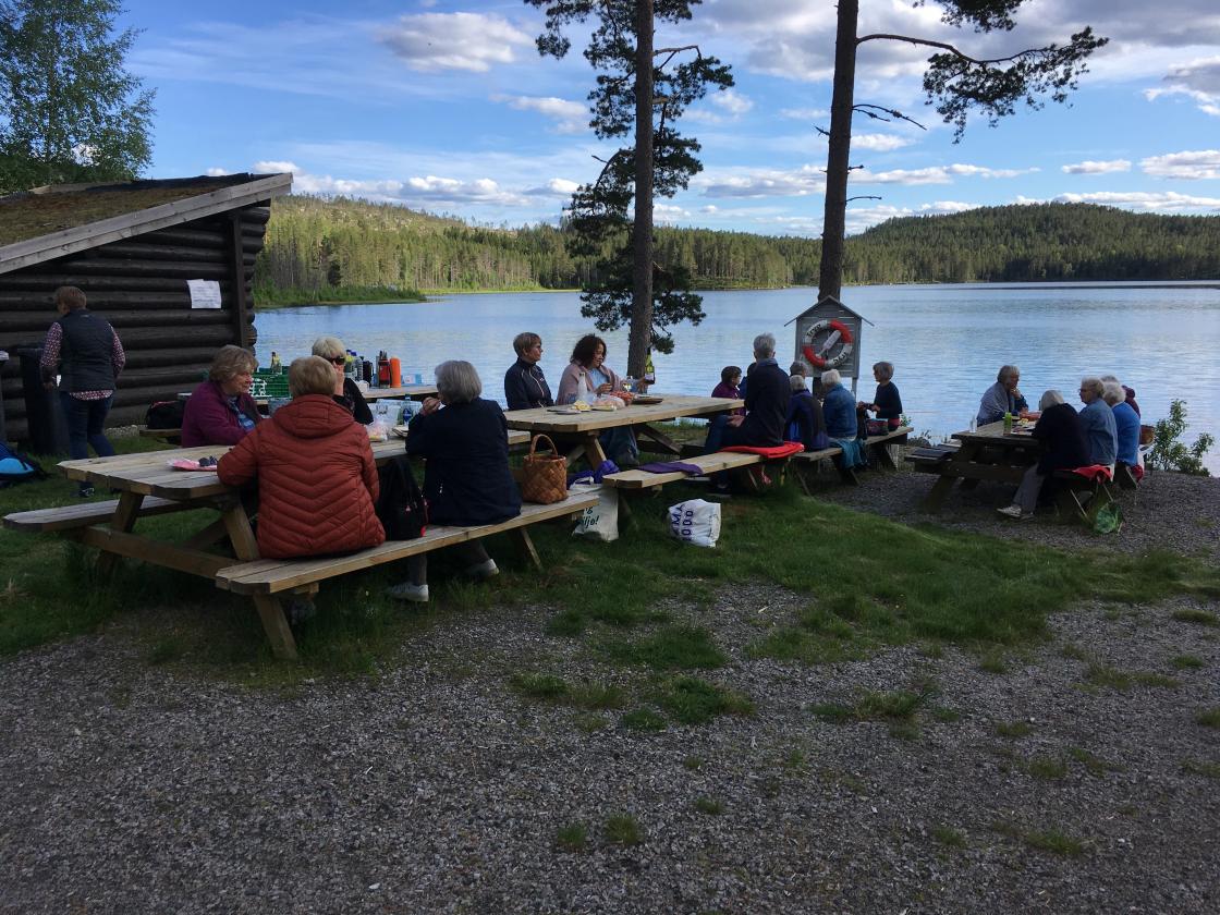 Grend 1 hadde ansvaret for møtet, og de hadde valgt å ha møtet ute i det fri. Brandval jeger og fisk lot oss få låne utebordene og gapahuken ved Damtjernet. Det er en veldig idyllisk plass langt til skogs. Vi var heldige med været denne kvelden med sol fra nesten skyfri himmel etter noen regnværsdager. Det var litt utøy i lufta så vi plasserte ut myggspiraler og andre myggjagere på bordene. Det holdt dem på avstand det meste av kvelden.