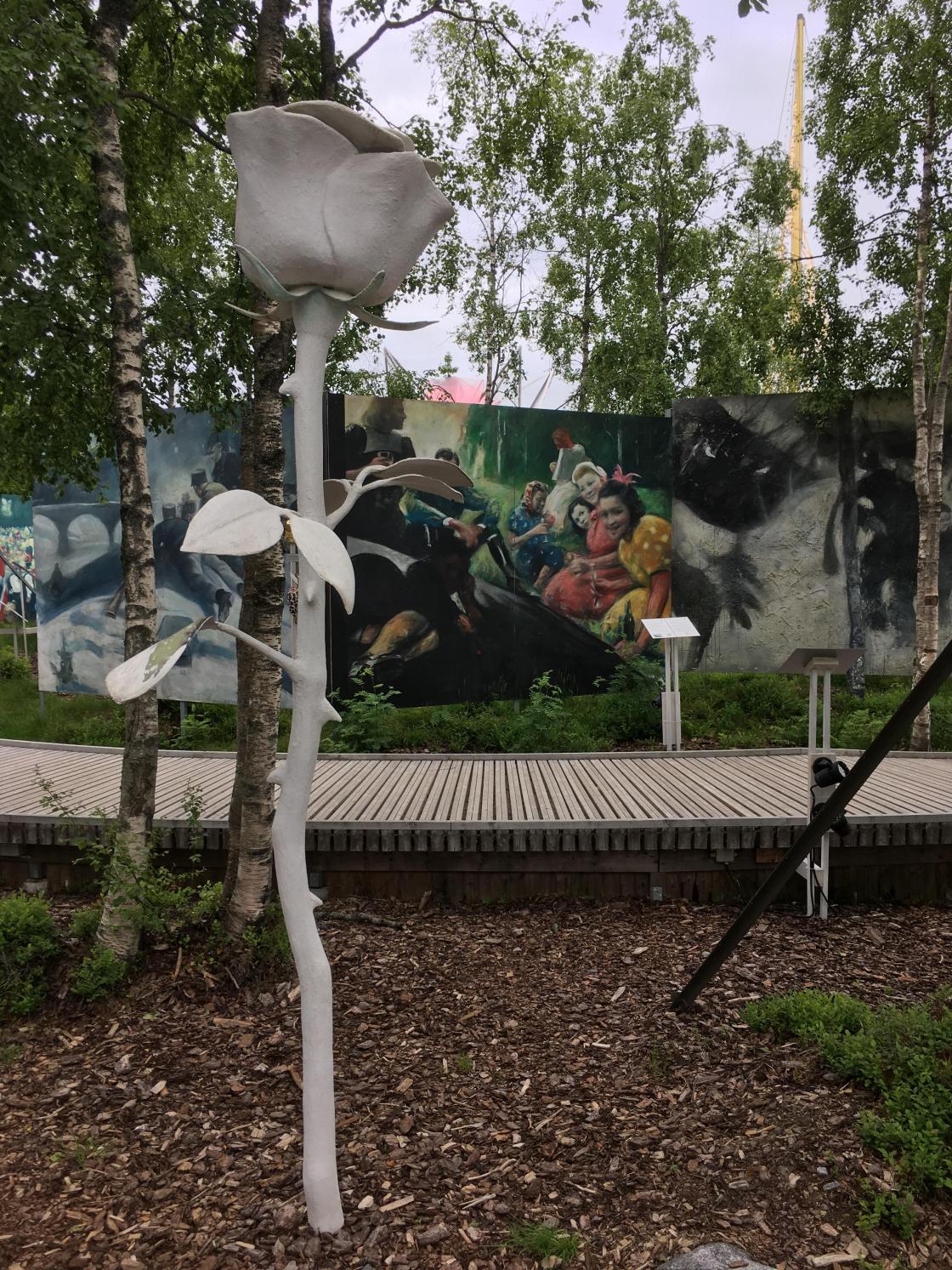 Vel fremme ved Roseslottet ble vi guidet rundt blant Vebjørns malerier og Eimunds geometriske figurer. Det var fascinerende å høre guiden fortelle om bakgrunnen for de forskjellige maleriene. Med dette prosjektet ønsker de å fortelle historien om okkupasjonen av Norge. Vi ble veldig imponert over antall malerier som var på denne utstillingen, og hvor uttrykksfulle og fantastiske de var. Det er ingen tvil om at Vebjørn er en dyktig maler.