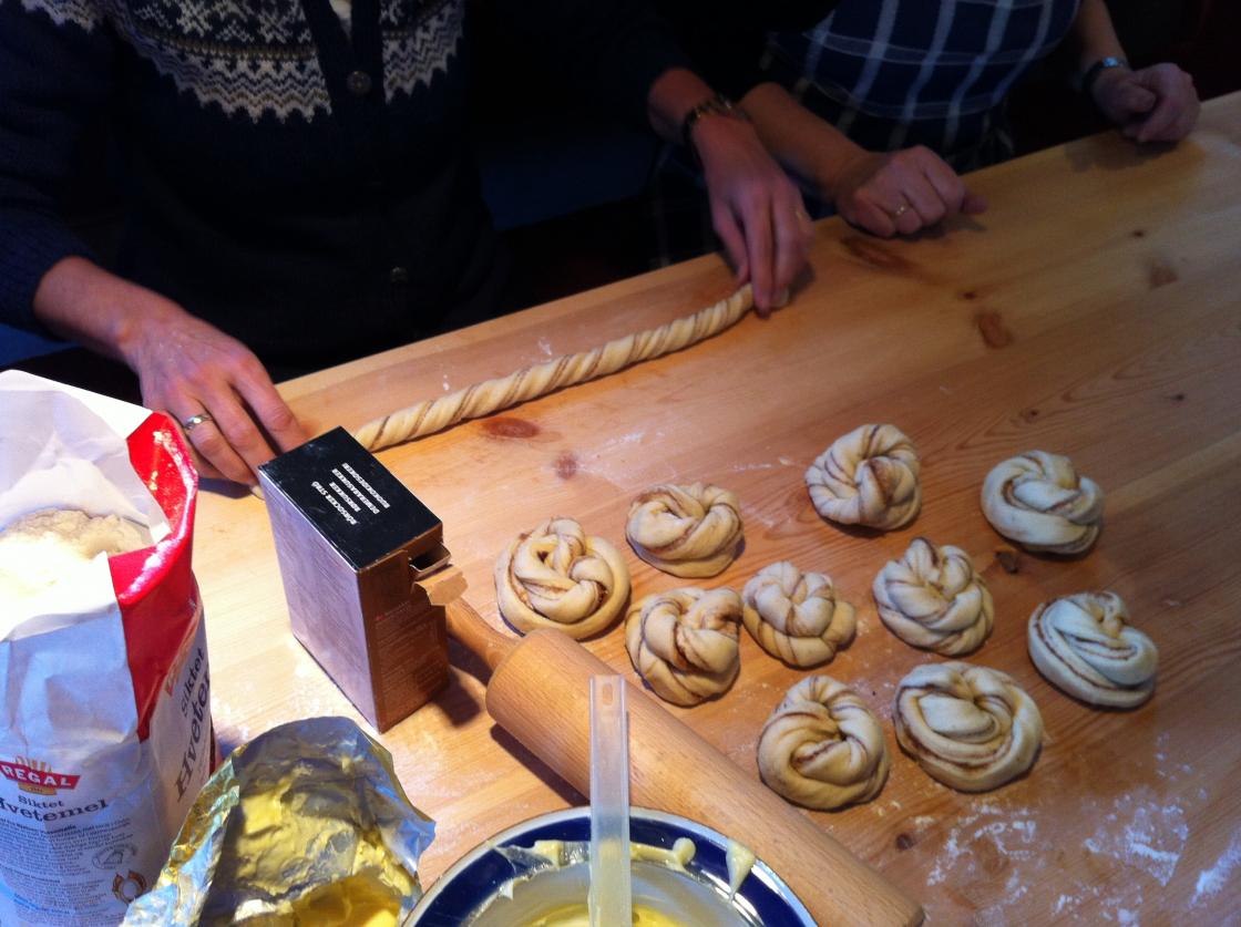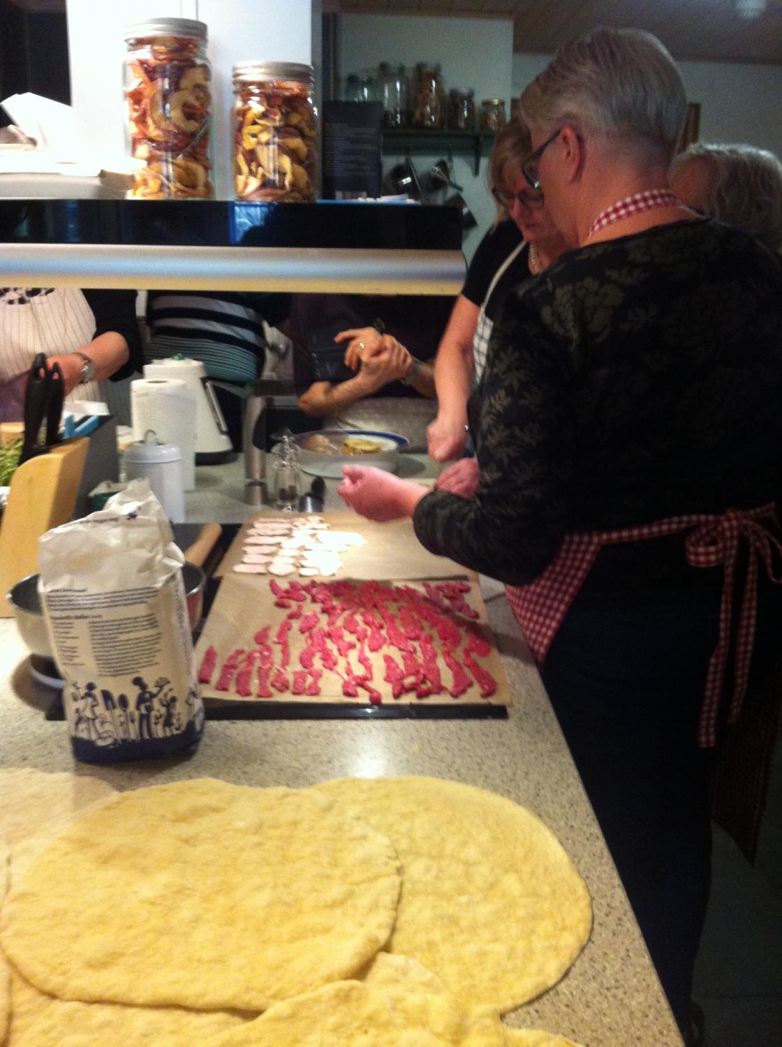 Vi var 18 personar frå Breim Bygdekvinnelag + 2 frå Loen som stillte på hos Kari Støfringsdal for baking av pizza og bollar. Vi baka pizza på Italiensk med tomatsaus og kvit pizzasaus med forskjellig slag fyll. Av kveitedeig laga vi tebirks og av søt kveitedeig vart det kanelknutar, vi fekk lære, for meg i alle fall, ein ny måte å forme kanelknutar.