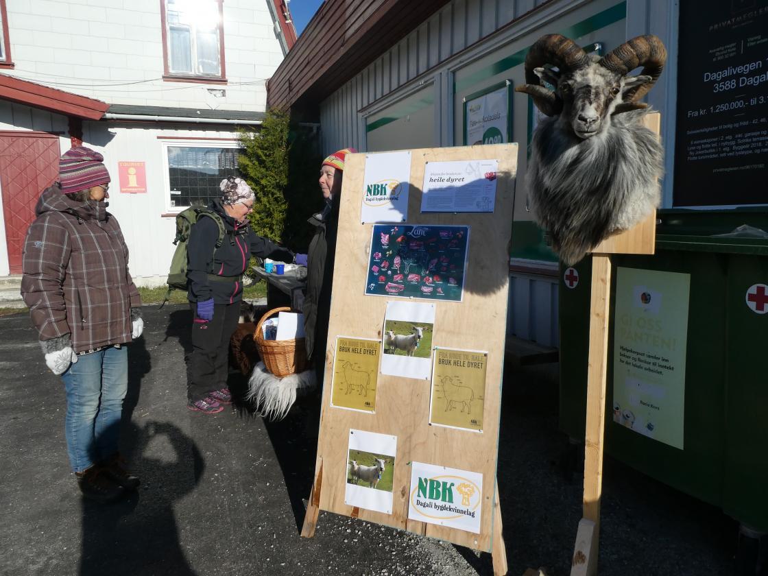 Det ble delt ut brosjyrer fra aksjonen til NBK "Bruk hele dyret". Det var mange hyggelige og positive folk ,- hyttefolk og fastboende. Noen fortalte de skulle ha saueskank til middag, eller får i kål eller lammecarré. Det var ikke bare det flotte sauehodet vi hadde med som interesserte folk; Oppdelingsguiden av lam ble studert, det samme ble skinnfellene som var tatt med. Det ble en fin markering utenfor butikken.
