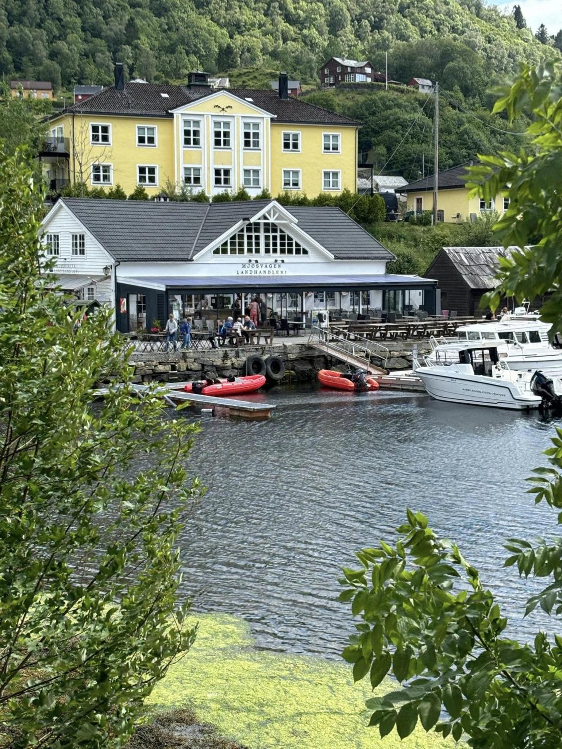 Neste stopp var Mjøsvågen. Me rusla litt rundt og såg på Hosanger kyrkje som låg fint på ein høgde nede ved sjøen. Nedanfor var det flott badeplass, men diverre var det ingen som hadde badedrakt med. Me hadde bestilt guide som skulle visa oss rundt og fortelja litt om bygningane og aktiviteten som hadde vore i Mjøsvågen i tidlegare tider. Åse møtte oss til avtalt tid og tok oss med langs rekka av gamle bygningar rundt heile vågen. Me var innom ein kisteverkstad som laga dei store utstyrskistene, Amerikakoffertar og seinare mindre koffertar. Me var og innom ein treskofabrikk og her laga dei framleis litt tresko. Eit anna av dei gamle sjøhusa var rusta opp og brukt til kafé om sommaren og ellers på sundagar. Kafeen vart drive på dugnad av foreninga Mjøsvågens venner. Til sist var med innom kunstgalleriet på den grøne fabrikken der det nettopp var opna ny utstilling. Her fekk me og besøka Flabellina, ei flytande kunstbadstove. Denne gjekk det an å tinga og så ta badstove og dukka seg i sjøen etterpå.