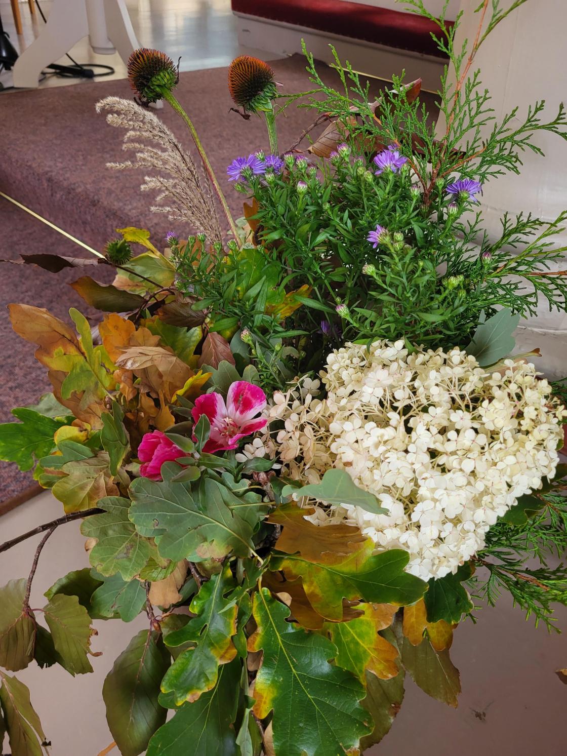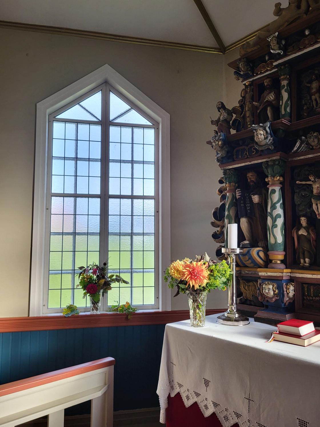 I år som før var den pyntet med blomster, gresskar og ulike grønnsaker dyrket i vår egen bygd 🍇🥔🥬🧅🧄🌸🍁