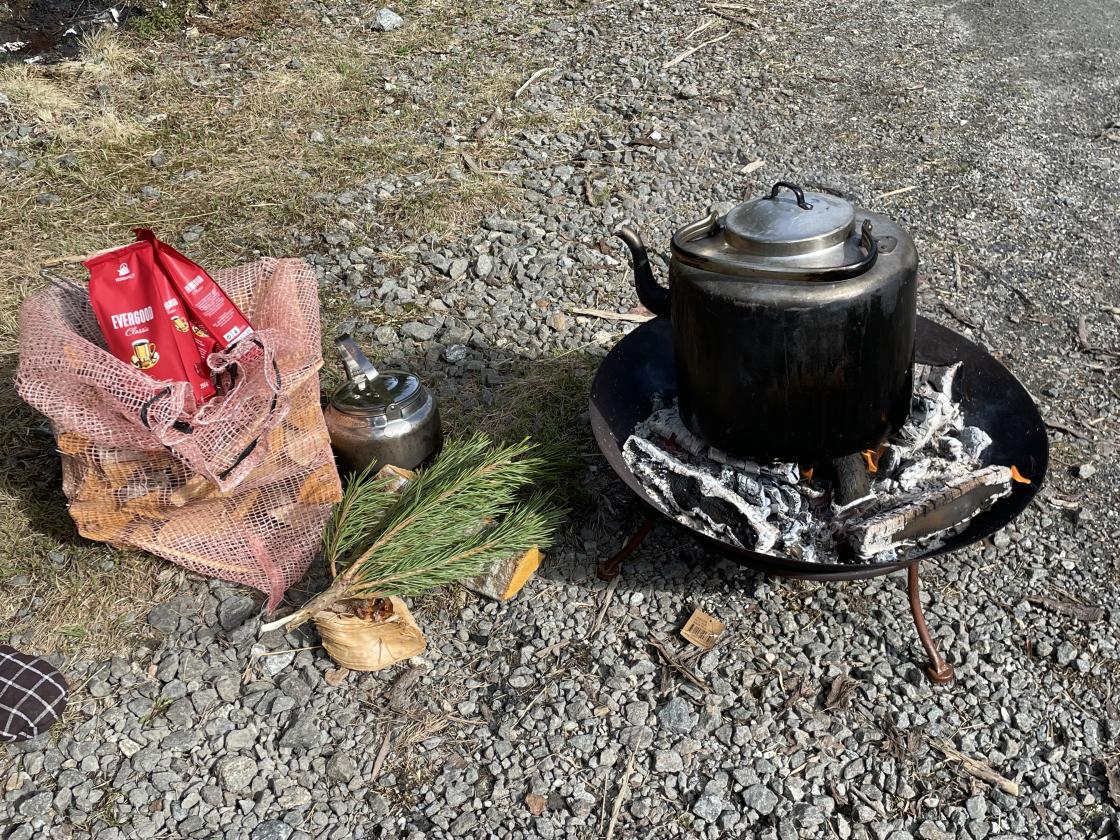 Gratis servering av pølser, saft, bålkaffe og til dessert; pinnesnurr som de oppmøtte måtte grille over bålet selv.