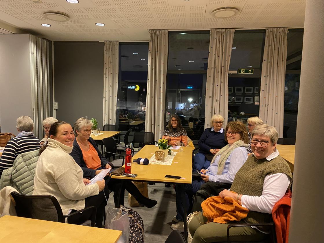 Strikkekafe med fullt hus. I alt 35 hadde tatt turen med og uten strikketøy.🧶