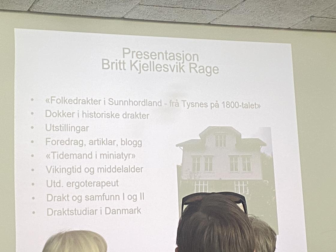 Britt Kjellesvik Rage som er tekstilkunstnar, var der og fortalte om dokkene sine som ho syr klær på,og som ho lager heilt frå bunn, Kroppen blir til av papir,ho syr drakter som er utrulig vakre, og det er veldig smått det ho sit og syr og lager til.Var utrulig interesant å sjå det ho hadde laga, med litt hjelp av mannen sin også, Knut Rage. Denne utstillingen ho hadde med seg var frå Adolf Tidemanns tid.