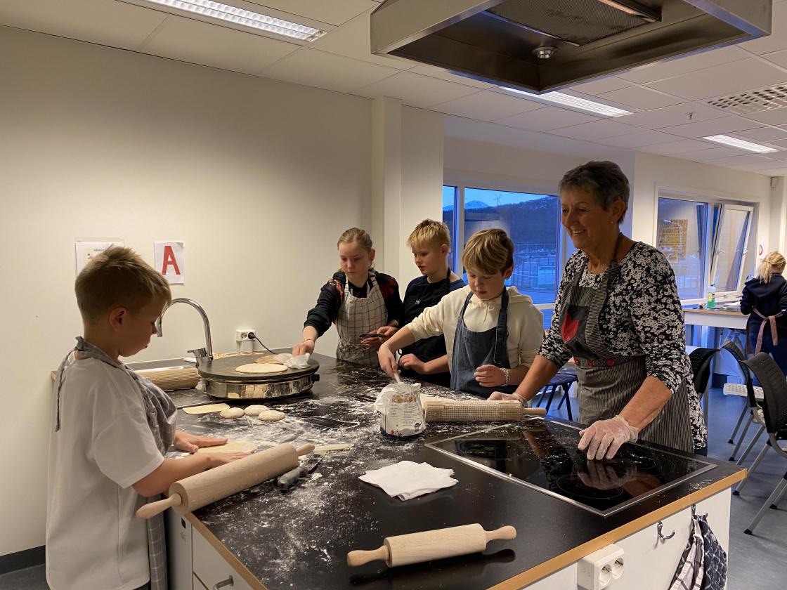 Bakedag på skulen i des 2023, Bygdekvinnene stiller opp og hjelper elevane med baking med nordlandskaker.