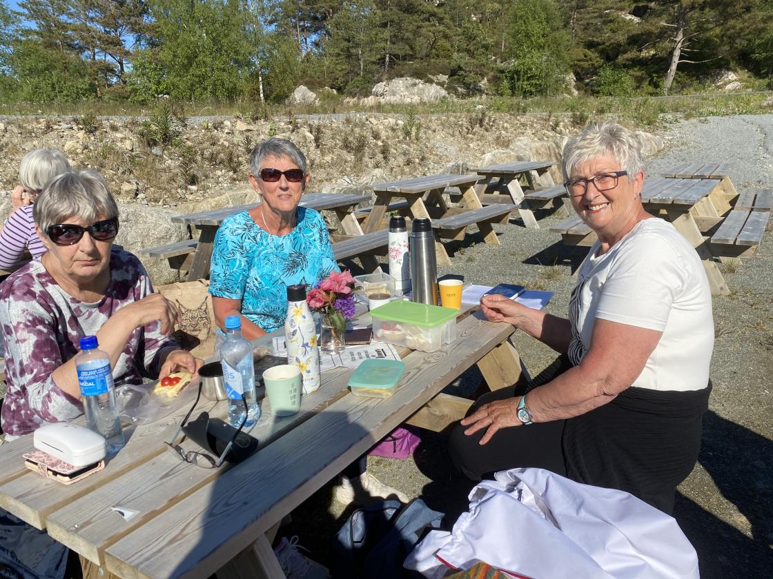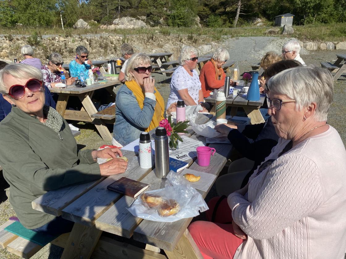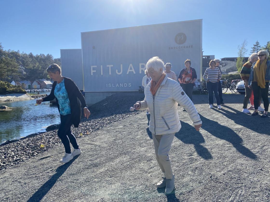 Nydeligt sommervær,kvar hadde kaffi med seg og noko å bita i. Me song ein fin sang til den vakre Fitjar bygda vår,, som er laga av Tora Vestbøstad. Ellers hadde me litt allsang og dikt lesing . Til slutt hadde me leker der nokon gjekk på stylter andre kasta ringer på blink, og me hadde kappgåing med egg. Veldig kjekk ettermiddag.