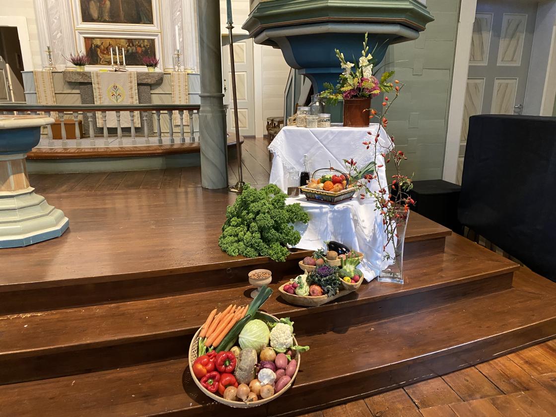 Fitjar Bygdekvinnelag pynta kyrkja til hausttakkefest.Medlemmene som var med å pynta var Toril Lyngvær ,Solveig Thomassen og Elin Korneliussen.